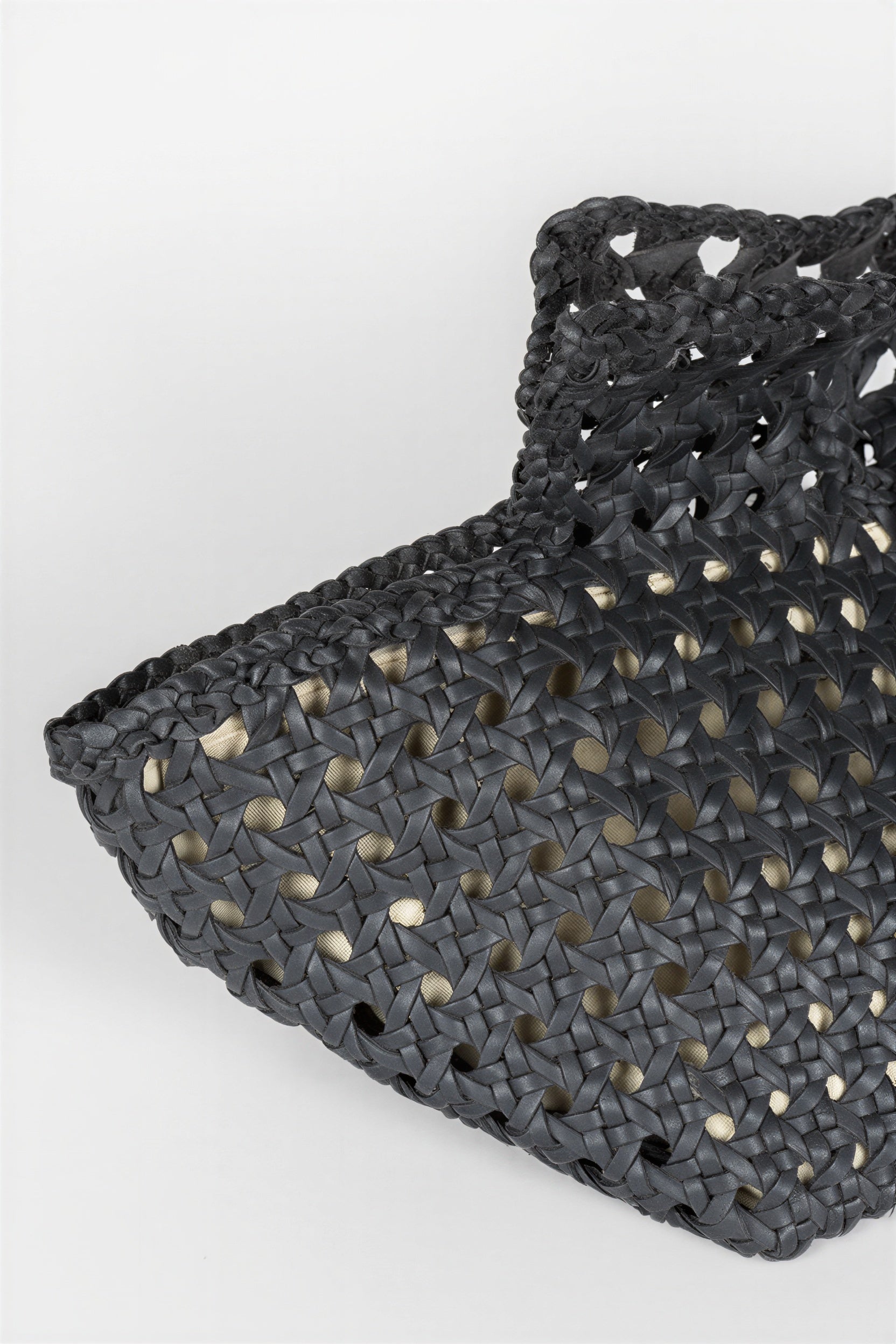 El trenzado integral realza la profundidad del color y aporta dinamismo visual, mientras que su estructura compacta mantiene proporciones equilibradas. Las asas integradas refuerzan su diseño minimalista y arquitectónico.