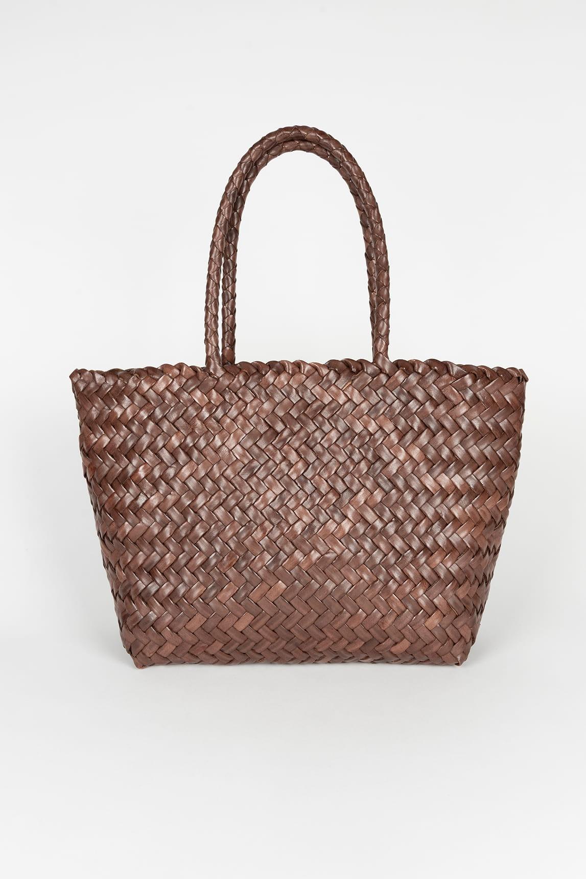 El acabado marrón potencia el aspecto artesanal del trenzado y lo convierte en un básico de fondo de armario: un bolso de piel marrón que nunca pasa de moda.