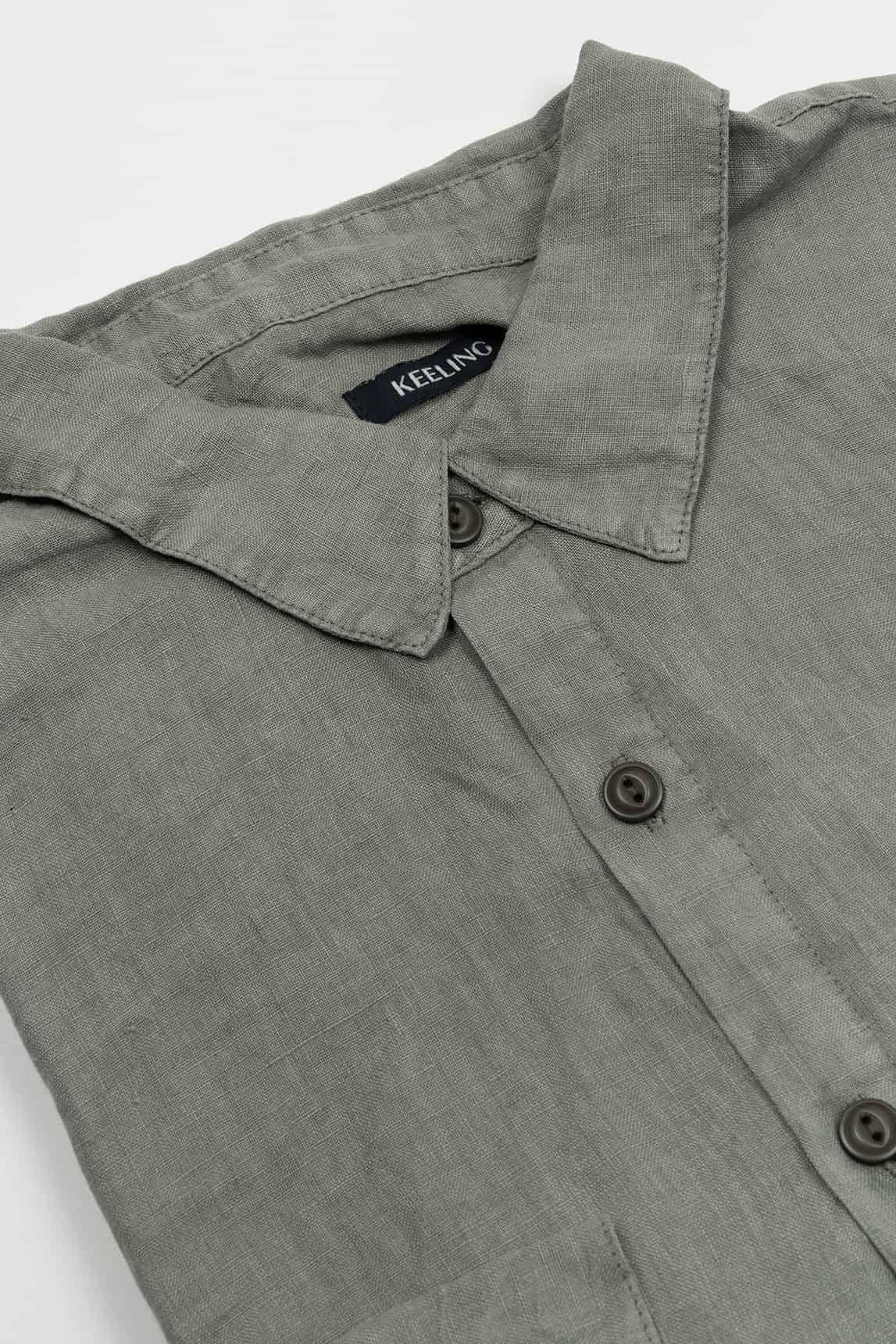 Men's long-sleeve olive green shirt, featuring a solid design and a straight, clean-lined silhouette. The model includes a classic collar, visible front button placket, and buttoned cuffs, maintaining a balanced image between functional and refined. The surface displays a subtle texture that enriches the color and gives it a natural finish, while the light drape promotes a comfortable and casual feel.