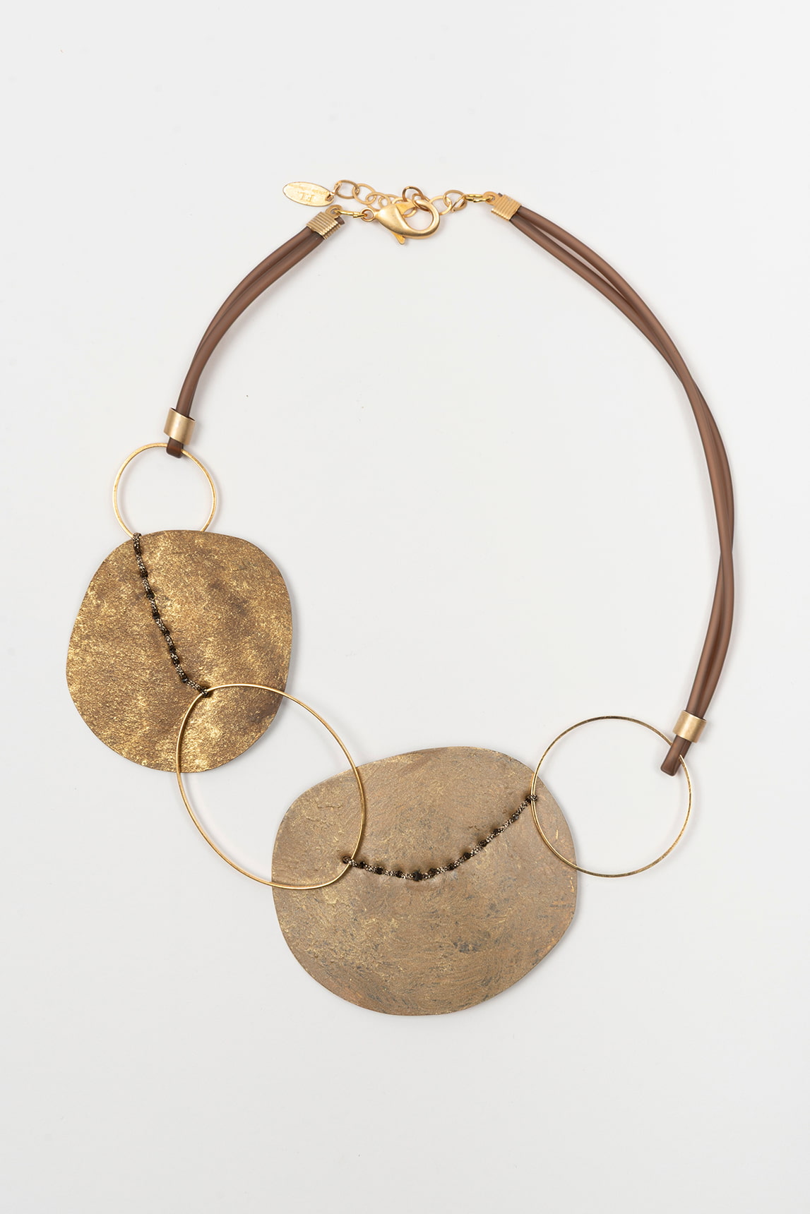 This short necklace combines organic and geometric shapes with great visual balance. Two irregular pieces of antiqued brass intertwine with lightweight gold hoops, joined by a black chain that adds texture and contrast. The design is completed with two satin-finished brown tubes that wrap around the neck with strength and elegance.