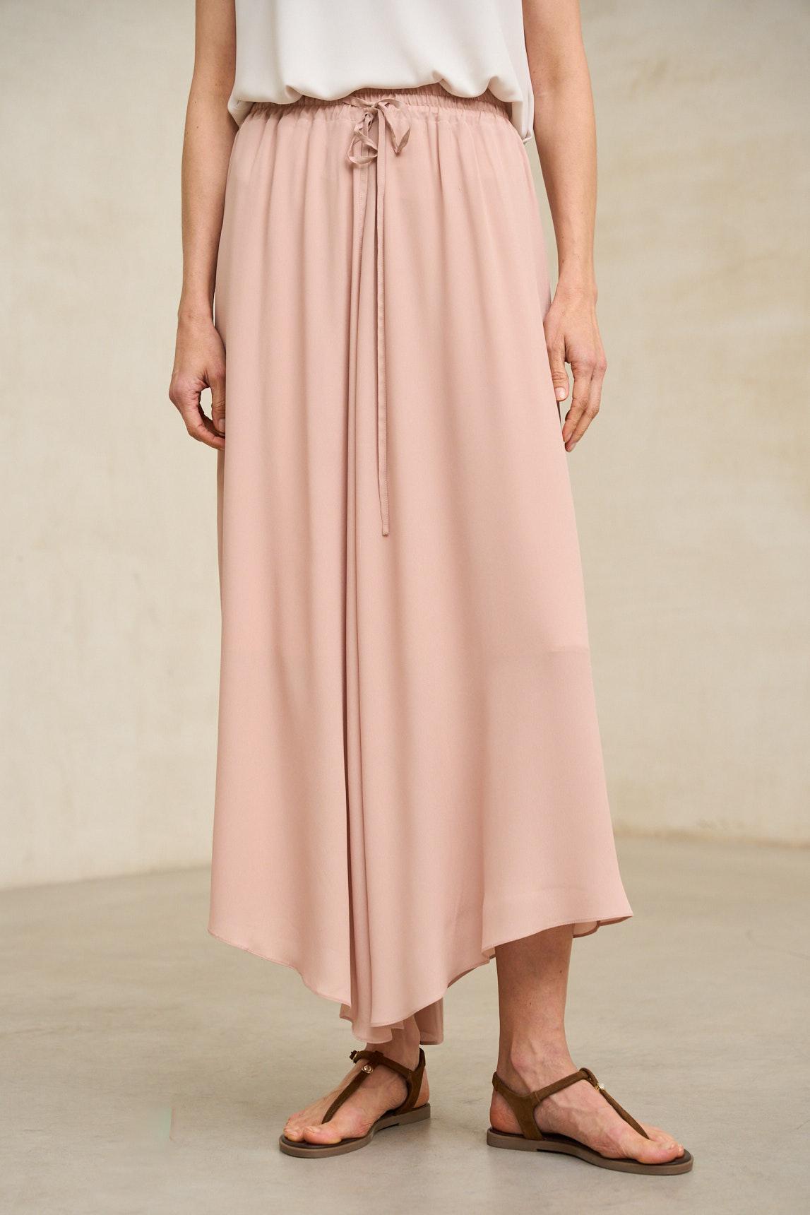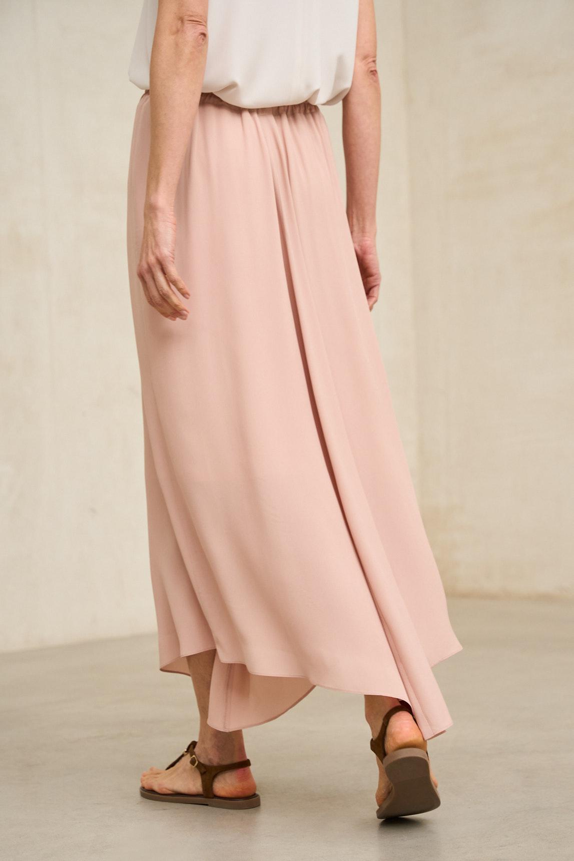 This midi skirt is crafted from a lightweight fabric with a soft drape and flowing movement. Its asymmetrical design with an irregular hem adds dynamism without sacrificing elegance. The smooth, powdery pink hue subtly and subtly enhances the silhouette with sophistication. The Ailén skirt in dusty rose stands out for its minimalist and feminine aesthetic. The color adds luminosity and allows for multiple combinations with tops in white, ecru, or sand tones, adapting to both relaxed styles and more formal occasions. Ideal for spring and summer, its fluid design flatters the figure and adds natural movement to your walk. A versatile piece that combines simplicity, elegance, and lightness. We strive to display colors as accurately as possible, but they may vary slightly from reality.