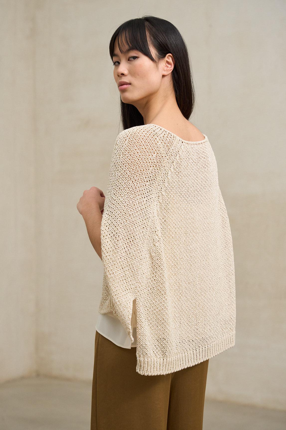 El jersey Calira crudo es una prenda ligera confeccionada en punto fino con textura sutil y un acabado de efecto semitransparente que aporta delicadeza y ligereza visual. Su diseño de manga al codo equilibra proporciones y le da un carácter contemporáneo, ideal para entretiempo o días templados.