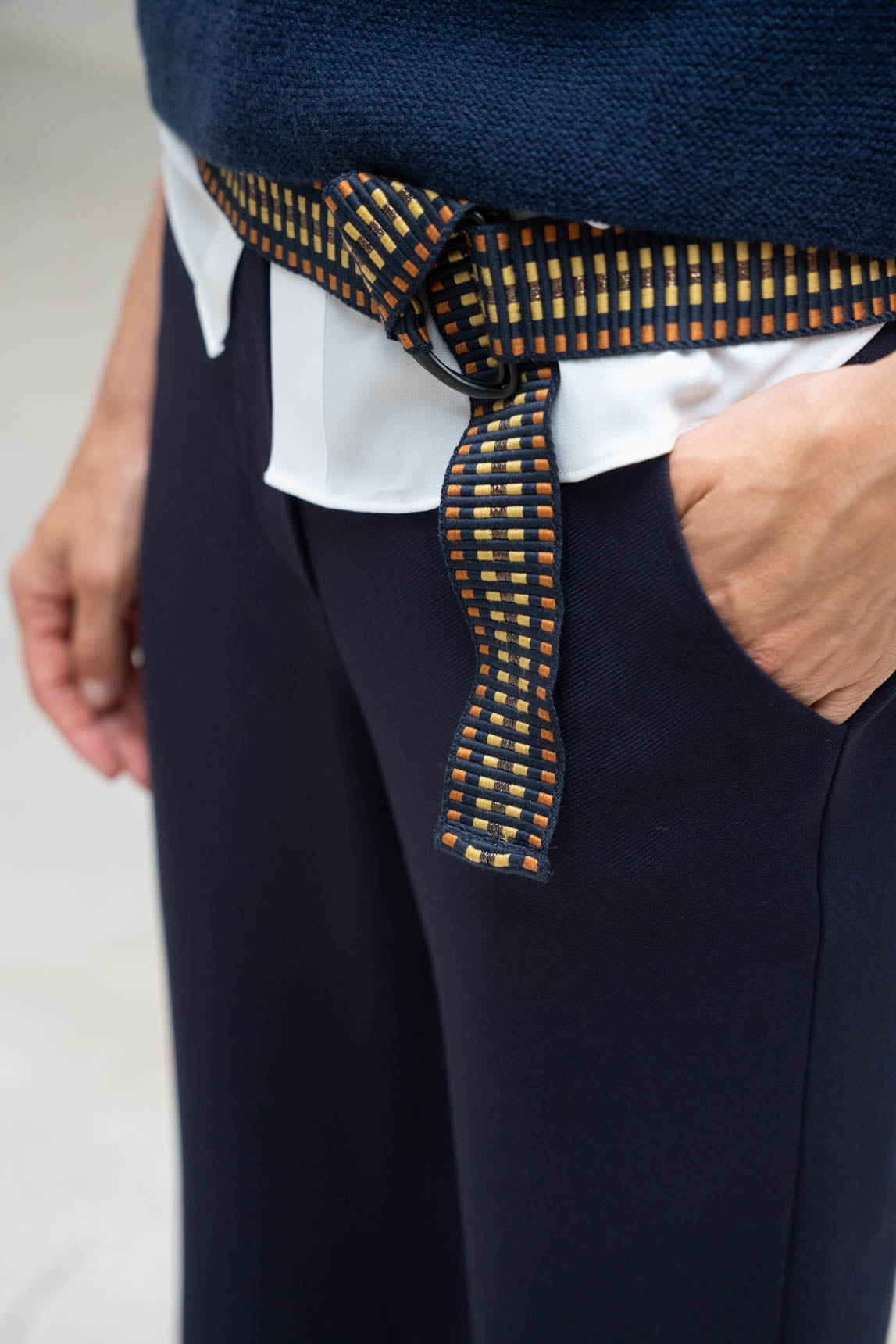 Add a touch of color to your looks with this striped belt. The contrast between its dark blue base and mustard, orange, and beige details creates a vibrant and modern look. Its metal ring closure makes it easy to adjust, adding personality to both casual and more polished outfits. A practical and stylish accessory to stand out every day.