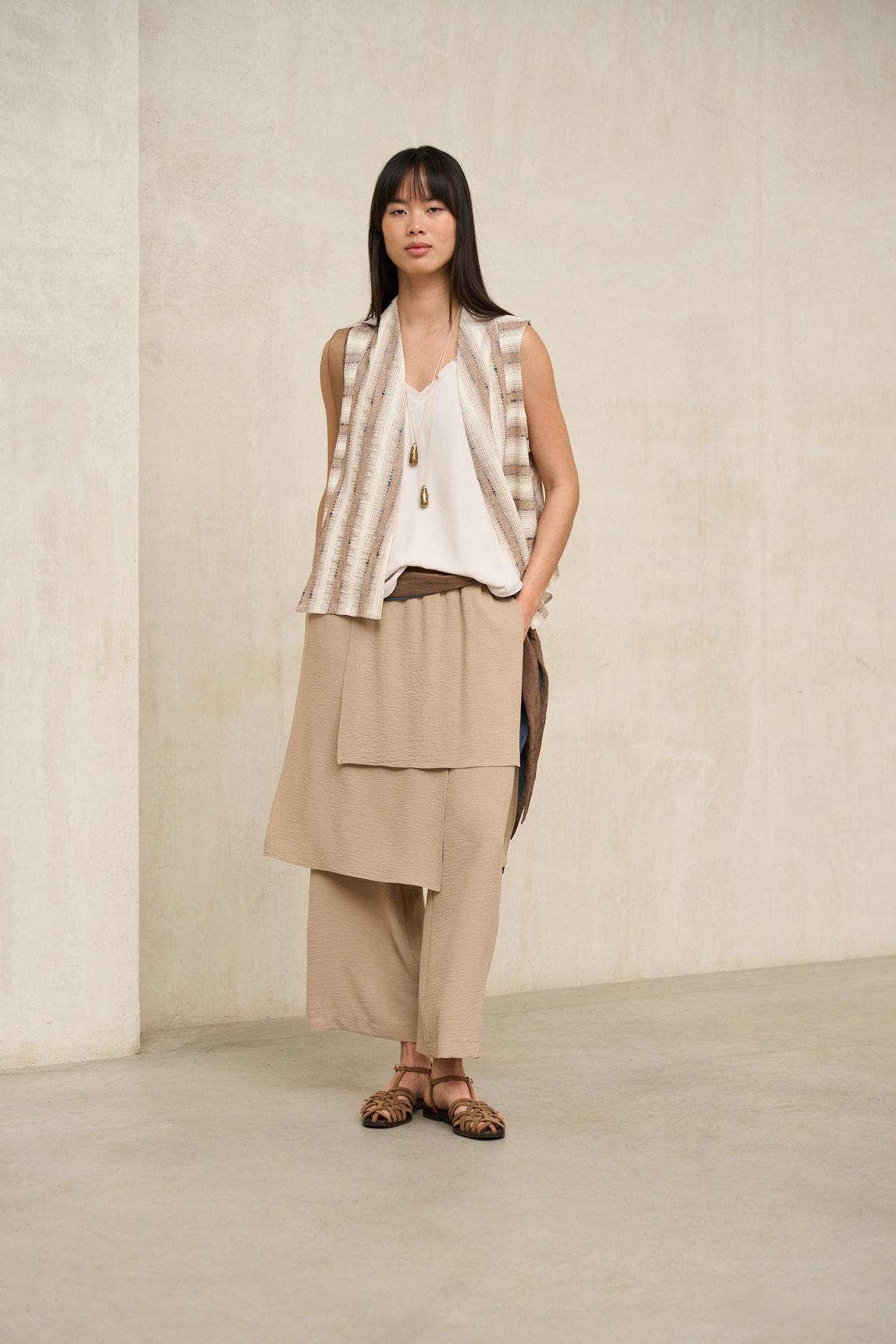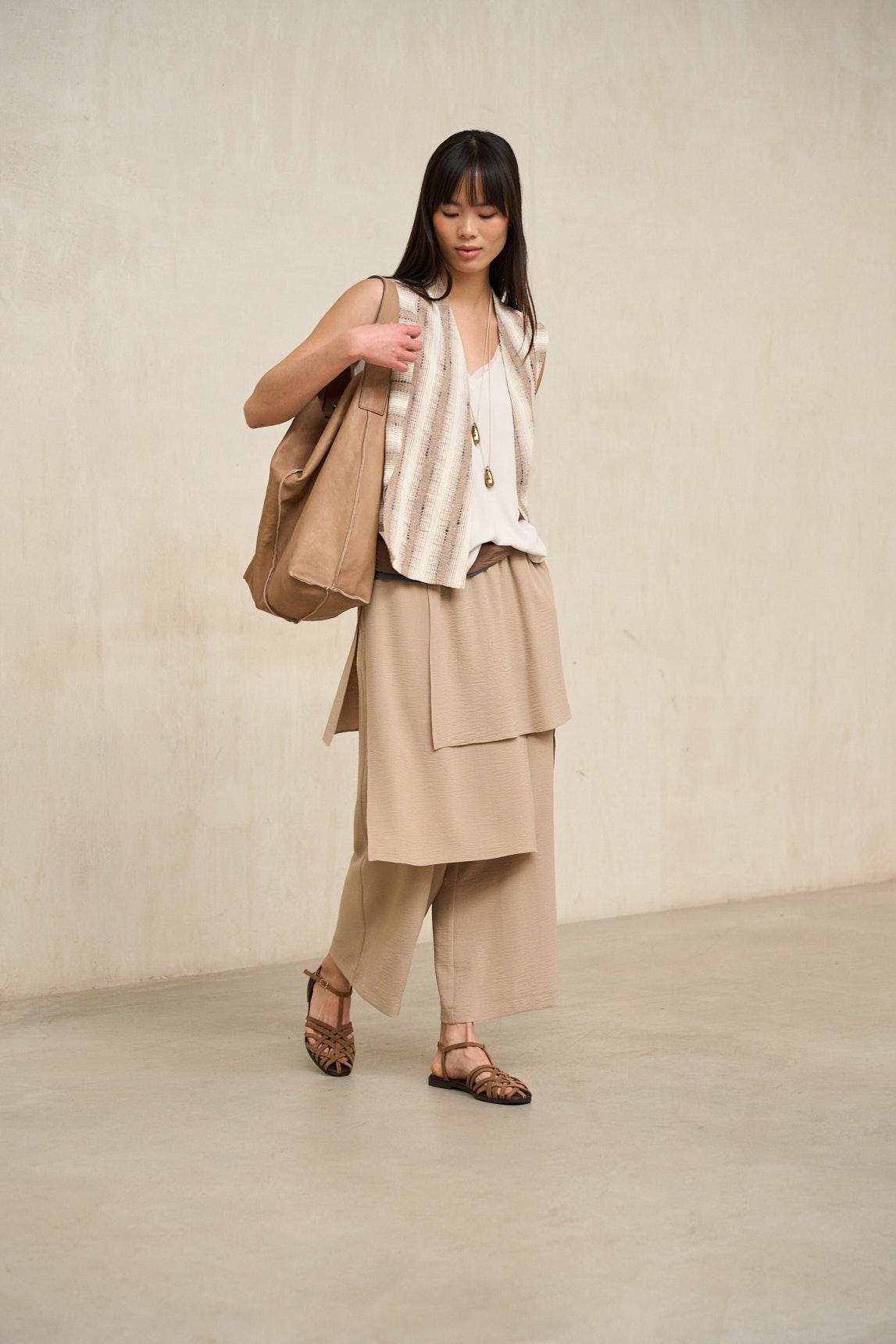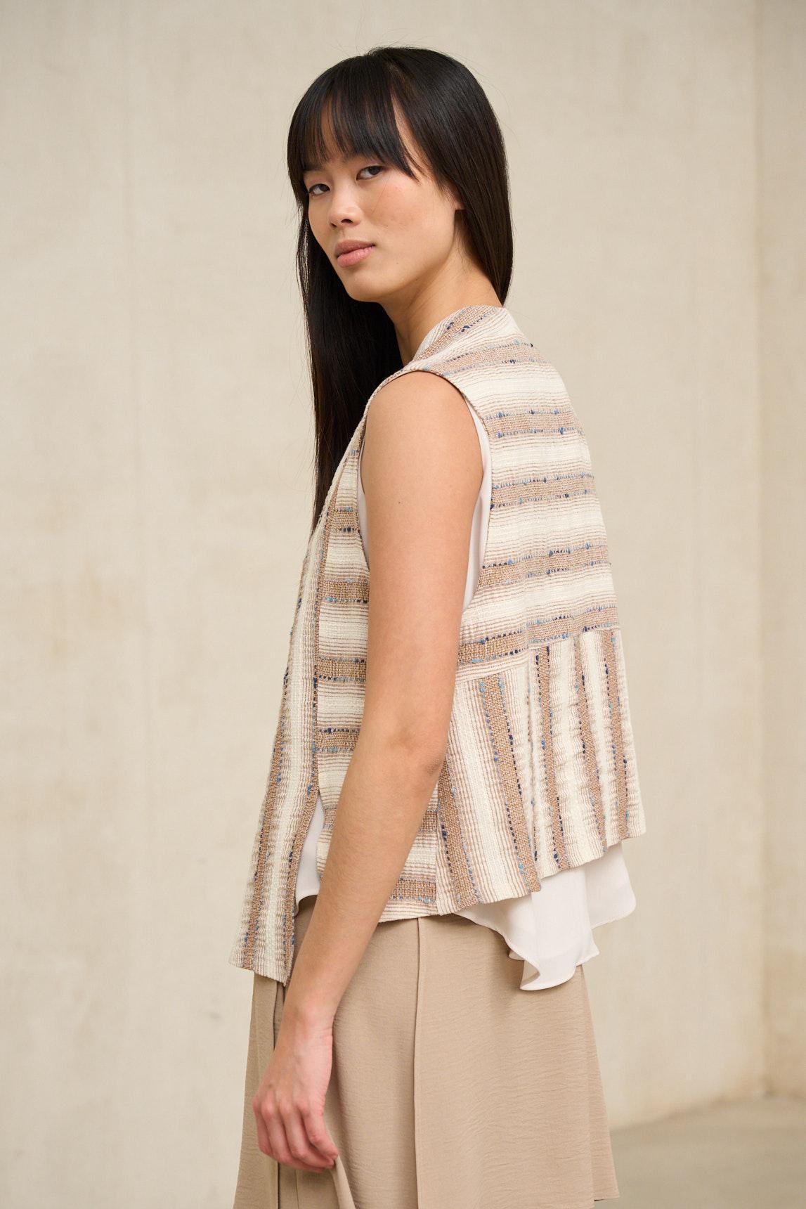 Este chaleco presenta una silueta abierta y relajada, sin cierre visible, que cae con naturalidad desde los hombros. El diseño destaca por su tejido de textura marcada con patrón geométrico en tonos arena y crudo, creando un efecto visual dinámico y artesanal. Incorpora bolsillos frontales de parche que refuerzan su carácter funcional, mientras que el corte recto y el largo a la cadera aportan equilibrio y comodidad. La estructura es ligera y permite superposición sin añadir rigidez al conjunto. En términos de estilo, es una prenda exterior versátil con inspiración étnica y contemporánea. Su fit relajado facilita llevarlo sobre camisetas básicas, blusas fluidas o prendas de punto fino, aportando textura y profundidad al look. Los tonos neutros permiten combinarlo con pantalones claros, denim o gamas tierra, integrándose con facilidad en armarios de estética natural. Pensado para completar estilismos de entretiempo, este chaleco aporta carácter sin sobrecargar. Se lleva abierto, acompañando el movimiento y sumando una capa visual interesante que transforma conjuntos sencillos en propuestas con personalidad y equilibrio. Nos esforzamos por mostrar los colores de la forma más fiel posible, pero pueden variar ligeramente respecto a la realidad.
