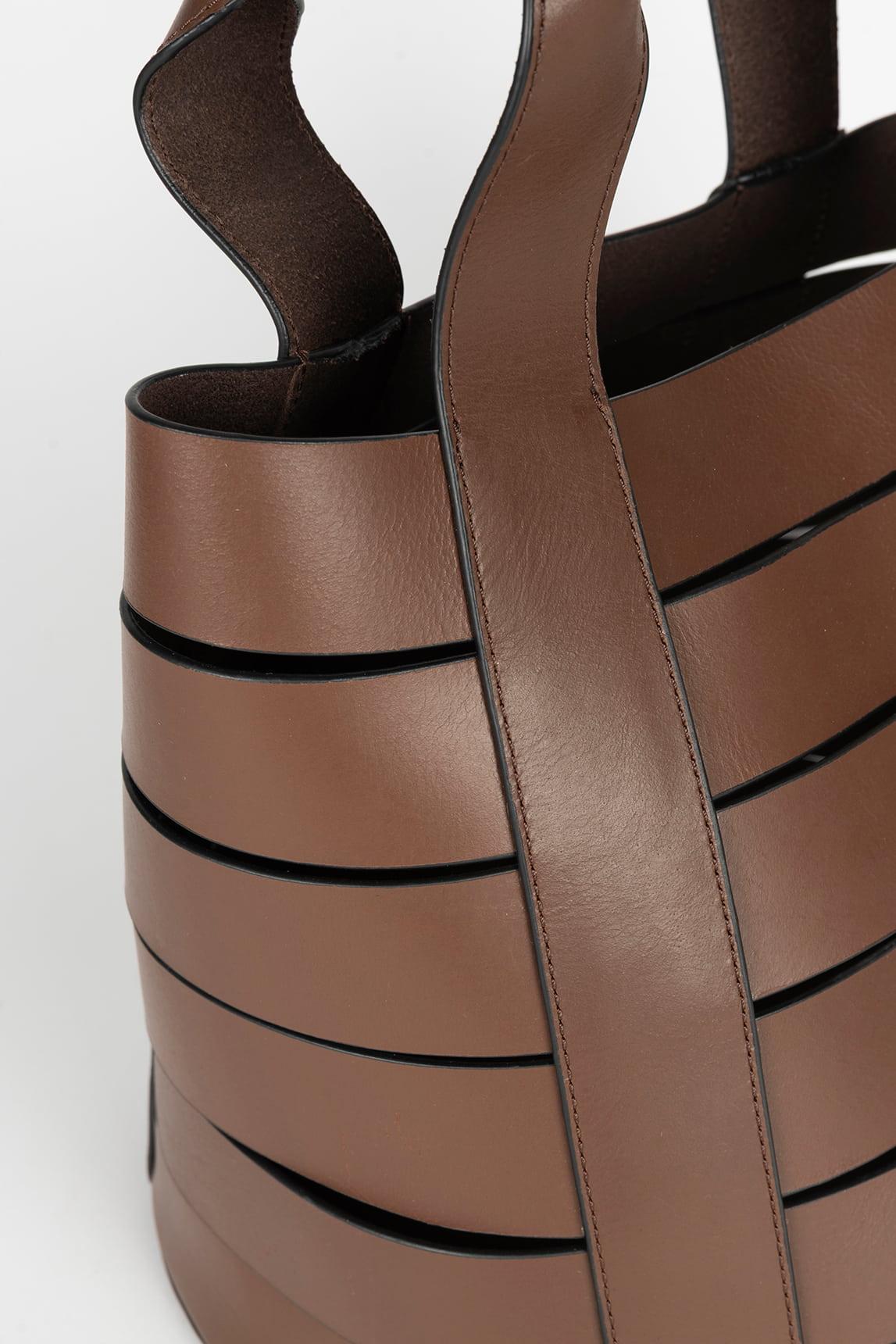 Bolso de piel en tono marrón chocolate, una versión sofisticada y atemporal del modelo. Su color profundo refuerza el carácter estructurado del diseño y lo convierte en una pieza elegante y fácil de combinar durante todo el año. El formato bucket con bandas horizontales aporta textura visual y una estética contemporánea. Las asas largas permiten llevarlo al hombro con comodidad, manteniendo una silueta definida y pulida. Con medidas de 17 x 12 x 10,5 cm y asa de 7 x 5,5 cm, es un bolso compacto pero con capacidad suficiente para acompañar la rutina diaria con estilo. Una opción ideal si buscas un bolso de piel marrón estructurado, con presencia y diseño diferencial. Nos esforzamos por mostrar los colores de la forma más fiel posible, pero pueden variar ligeramente respecto a la realidad.