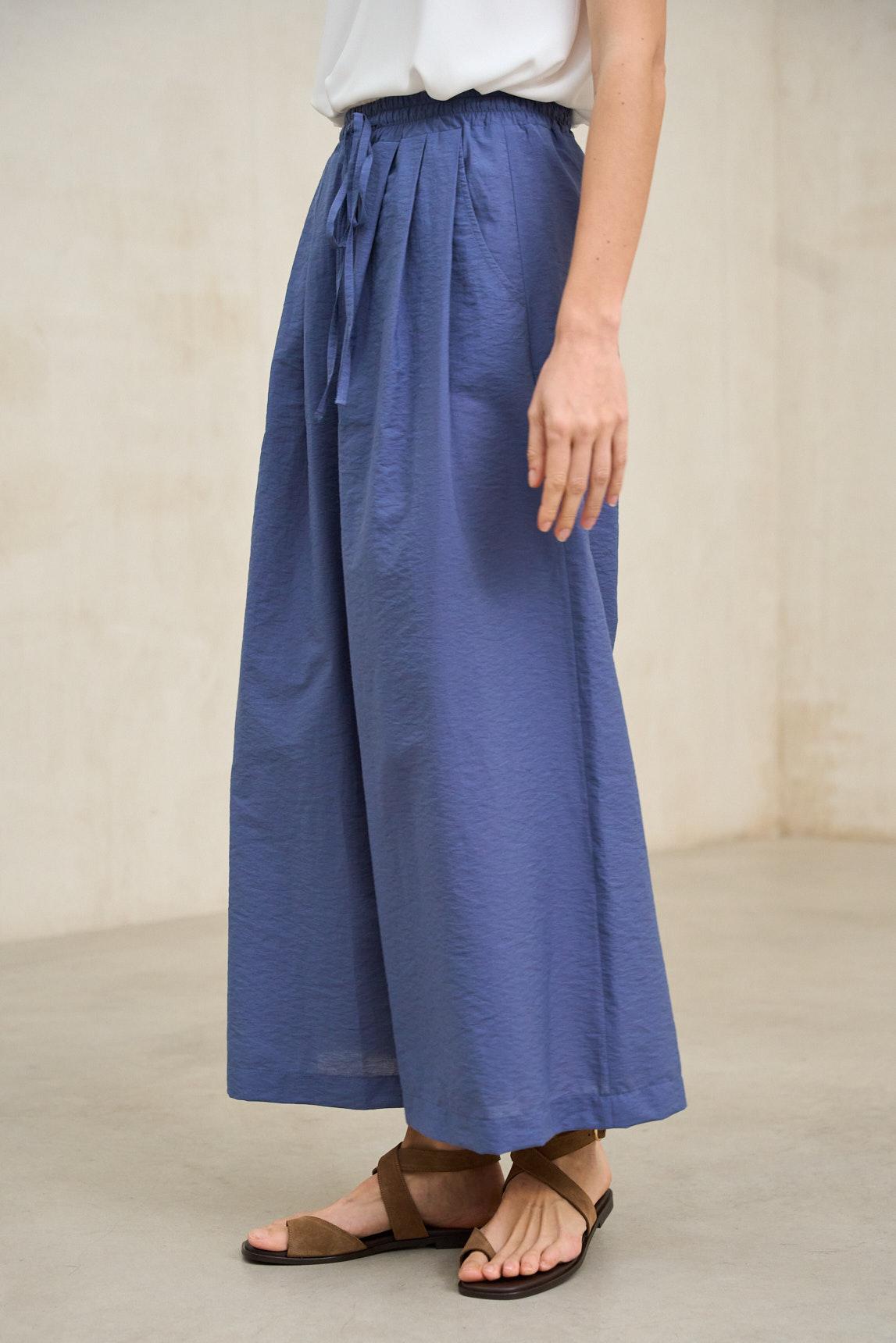 Women's trousers made from a lightweight fabric with a natural-looking crinkled texture, soft to the touch and with a flowing drape. They feature an elasticated waistband with an adjustable drawstring for a comfortable and adaptable fit. Functional side pockets and a wide, straight leg provide freedom of movement and a relaxed silhouette. The dark blue Drift Trousers bring a fresh and contemporary feel to the style. Their deep yet versatile shade serves as an alternative to classic neutrals, easily pairing with off-white, ecru, sand, or even earth tones to create a balanced contrast. They are designed for relaxed spring and summer looks, where comfort and natural aesthetics coexist with understated elegance. Ideal for everyday life, travel or informal plans, it maintains the artisanal character of the Drift model with a more defined and modern touch. We strive to display colors as accurately as possible, but they may vary slightly from reality.