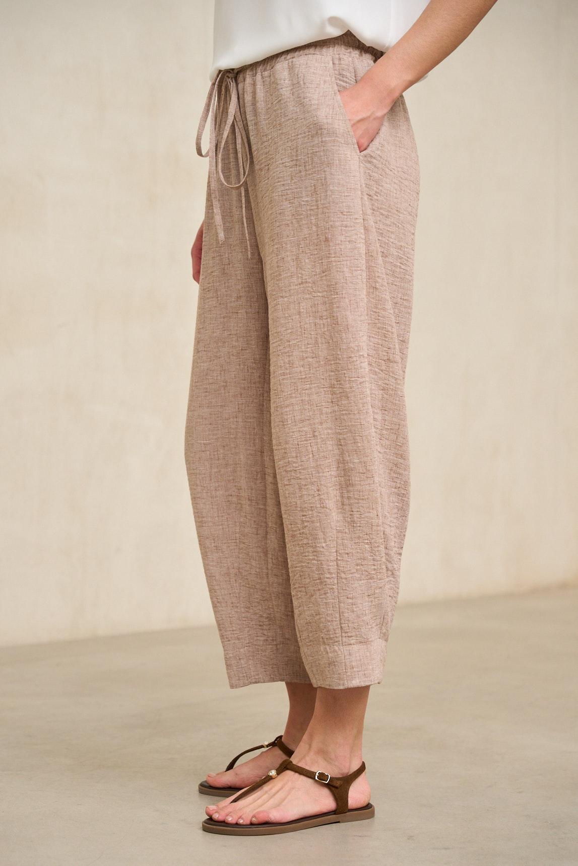 Pantalón de mujer confeccionado en tejido ligero de textura natural con caída fluida. Diseño de cintura elástica con fruncido suave y pernera amplia que se recoge ligeramente en el bajo, aportando volumen y movimiento equilibrado. Los bolsillos laterales completan su estructura funcional y limpia.