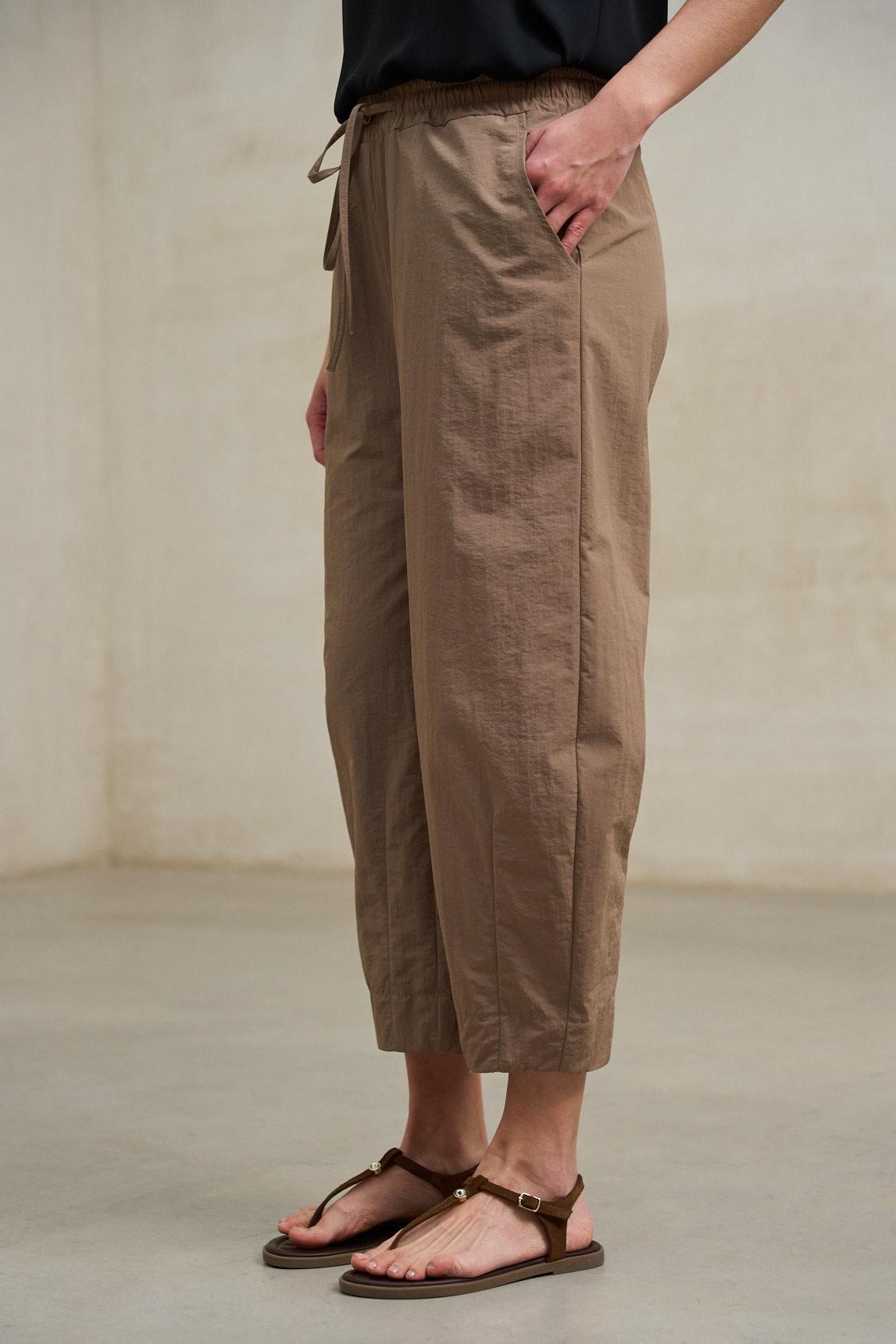 These trousers with a gathered elastic waistband stand out for their straight, wide-legged cut, featuring front darts that control the volume and provide a more polished finish. The brown color looks warm and versatile, and the garment maintains a light and soft appearance, with a length above the ankle that gives the look a more airy feel.