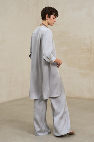These wide-leg trousers feature a defined waistband and a nearly imperceptible central zip fastening that keeps the front clean. The leg falls straight and fluidly, creating a long, light silhouette, and the fabric feels smooth and soft to the touch, with a continuous movement that lends a sophisticated finish. Their ankle-length hem gives the look a fresh and modern feel.