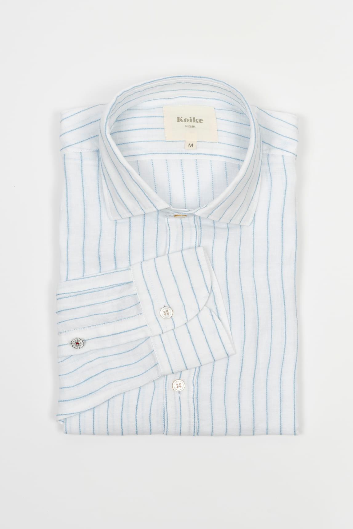 Men's white shirt with a soft blue vertical stripe, straight silhouette, and classic collar. The design features a front button closure, long sleeves, and buttoned cuffs, maintaining a clean, bright, and balanced look. The fine stripe adds visual dynamism and reinforces a timeless aesthetic, very easy to integrate into refined outfits.