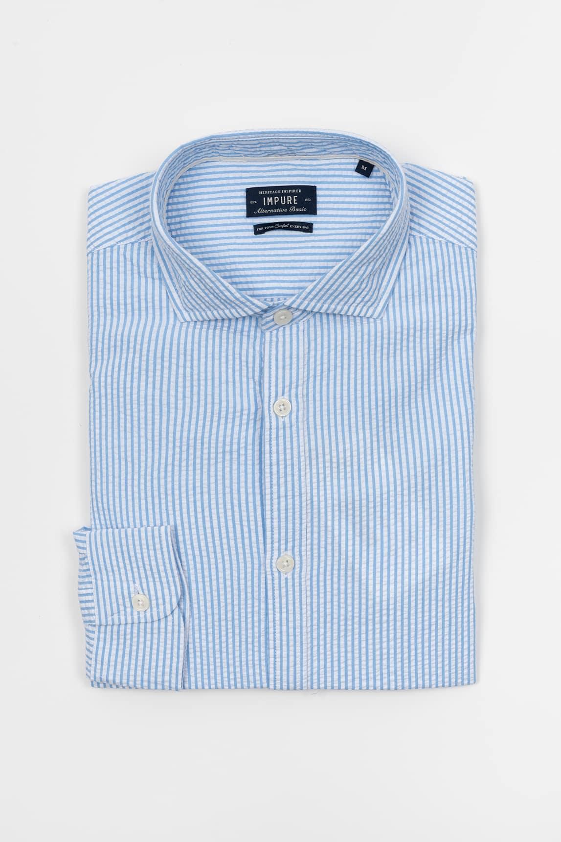 Long-sleeve sky blue shirt with a subtle vertical stripe and a light, fresh-looking construction. The design features a classic collar, exposed front button placket, and buttoned cuffs, maintaining a clean and balanced appearance. The surface has a soft visual texture that complements the apparent linear weave, while the straight, fluid drape reinforces a comfortable and natural feel for the overall look.