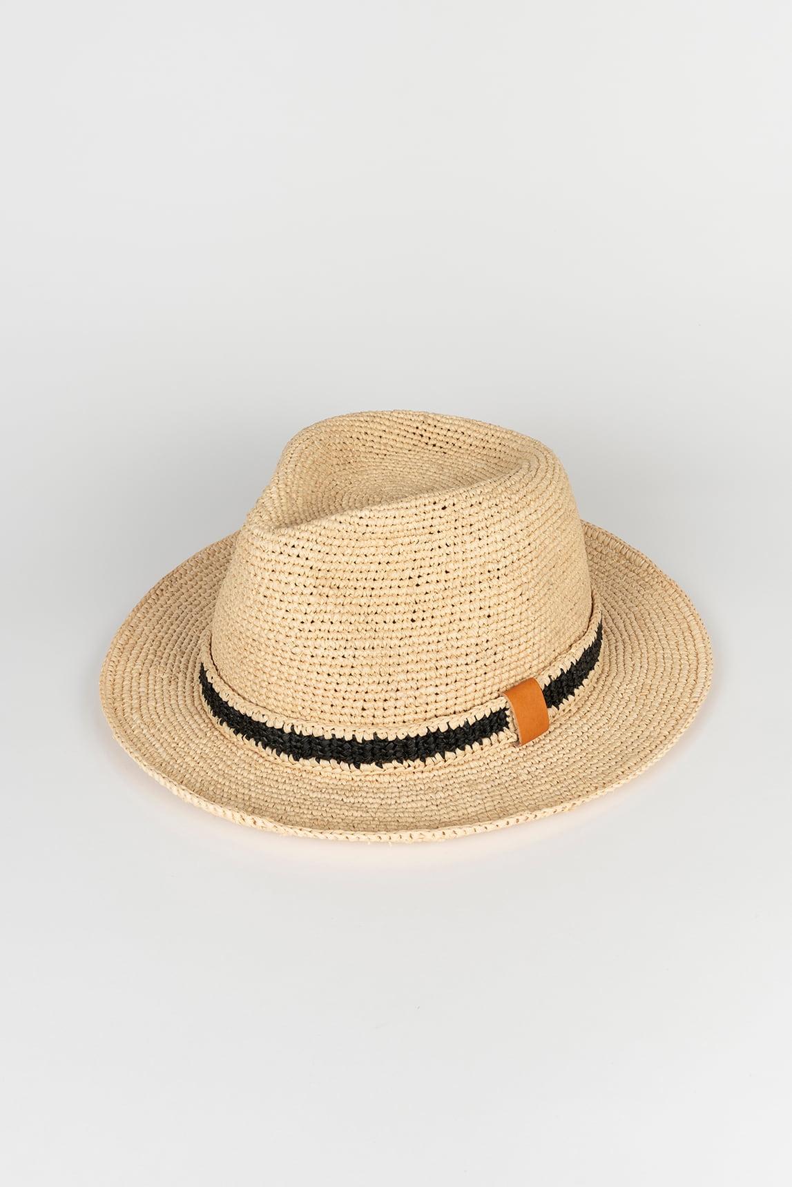 Women's hat in natural color with a fedora-inspired crown, medium brim, and an openwork, handcrafted look. The design features a lightweight open-weave structure that provides visual freshness and a very summery image, while the contrasting black band introduces a more striking and contemporary detail. The combination of tones reinforces its presence without losing its natural look.