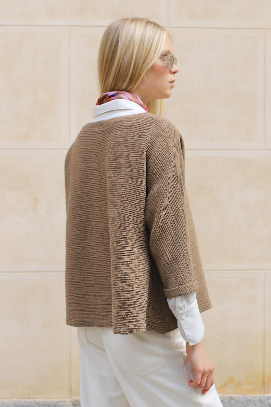 El top Siena es un básico con carácter. Su tejido de punto con relieve tipo plissé aporta movimiento y camufla, mientras el fit relajado favorece sin ceñir y permite superponer sobre camisas o llevarlo solo. La manga 3/4 con vuelta y el cuello caja rematan un diseño limpio y versátil, perfecto para combinar con vaquero blanco, sastre en tonos tierra o falda midi. Ligero, cómodo y con ese toque sofisticado que funciona del trabajo a los planes de fin de semana.