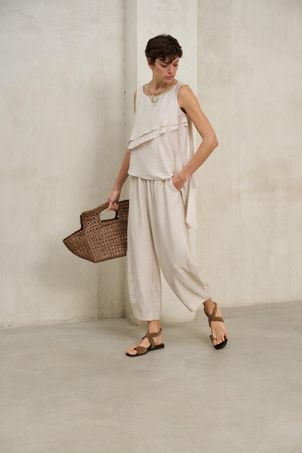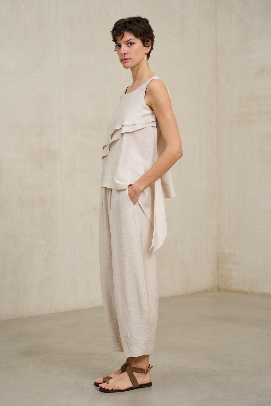 Esta blusa de escote redondeado y hombros al aire presenta una textura delicadamente arrugada que le da profundidad al crudo roto. El detalle protagonista es el volante frontal en capas, que aporta volumen suave y un movimiento ligero sobre el delantero. La silueta se percibe amplia y fluida, con bajo asimétrico e irregular que estiliza y deja el look más etéreo, además de una abertura trasera con cierre discreto. El crudo se vuelve especialmente versátil: combina con denim oscuro para un contraste moderno, con pantalón beige para un conjunto luminoso o con negro para un efecto más sofisticado. El volante aporta interés sin necesidad de accesorios, y el corte holgado permite llevarla por fuera o con un semimetido para marcar la cintura. Es una prenda pensada para cuando quieres verte arreglada sin complicarte: fresca, ligera y con un detalle que se nota a primera vista. Ideal para celebraciones de día, cenas en terraza o para elevar un look básico con un toque delicado. Nos esforzamos por mostrar los colores de la forma más fiel posible, pero pueden variar ligeramente respecto a la realidad.