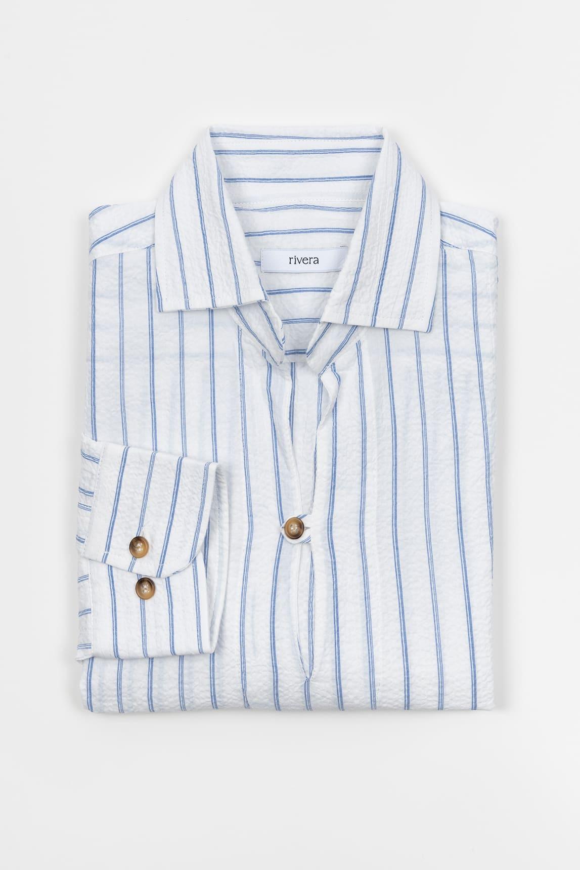 Camisa de hombre de manga larga con fondo blanco y raya vertical en azul suave, diseñada con silueta recta y una imagen ligera de inspiración atemporal. Presenta cuello abierto, abertura frontal corta y puños abotonados, creando un equilibrio natural entre comodidad y presencia. La raya vertical estiliza visualmente el conjunto, mientras la superficie de aspecto ligero refuerza una sensación fresca y relajada muy fácil de llevar.