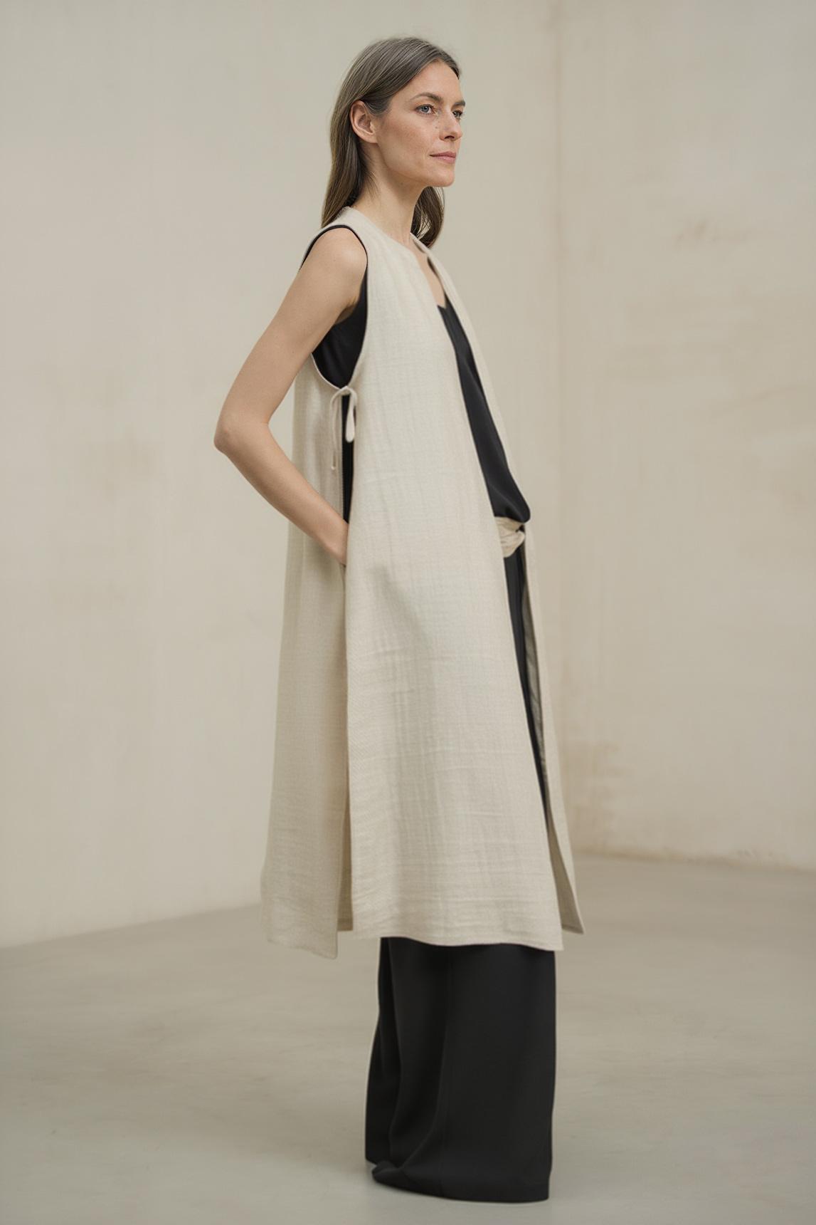 El chaleco Mireth es una prenda ligera y estructurada que aporta sofisticación relajada a cualquier conjunto. Confeccionado en tejido fluido de caída suave, presenta un diseño sin mangas y silueta abierta que estiliza visualmente la figura y permite jugar con las superposiciones.