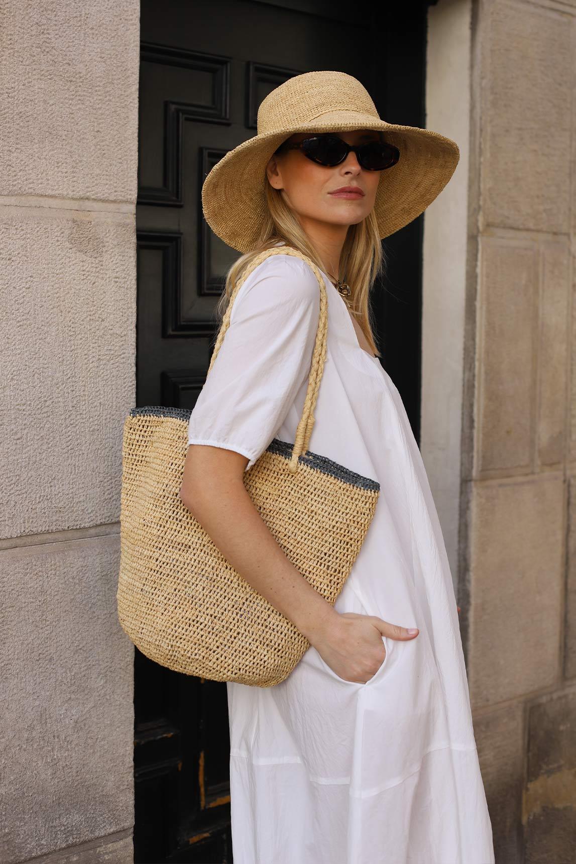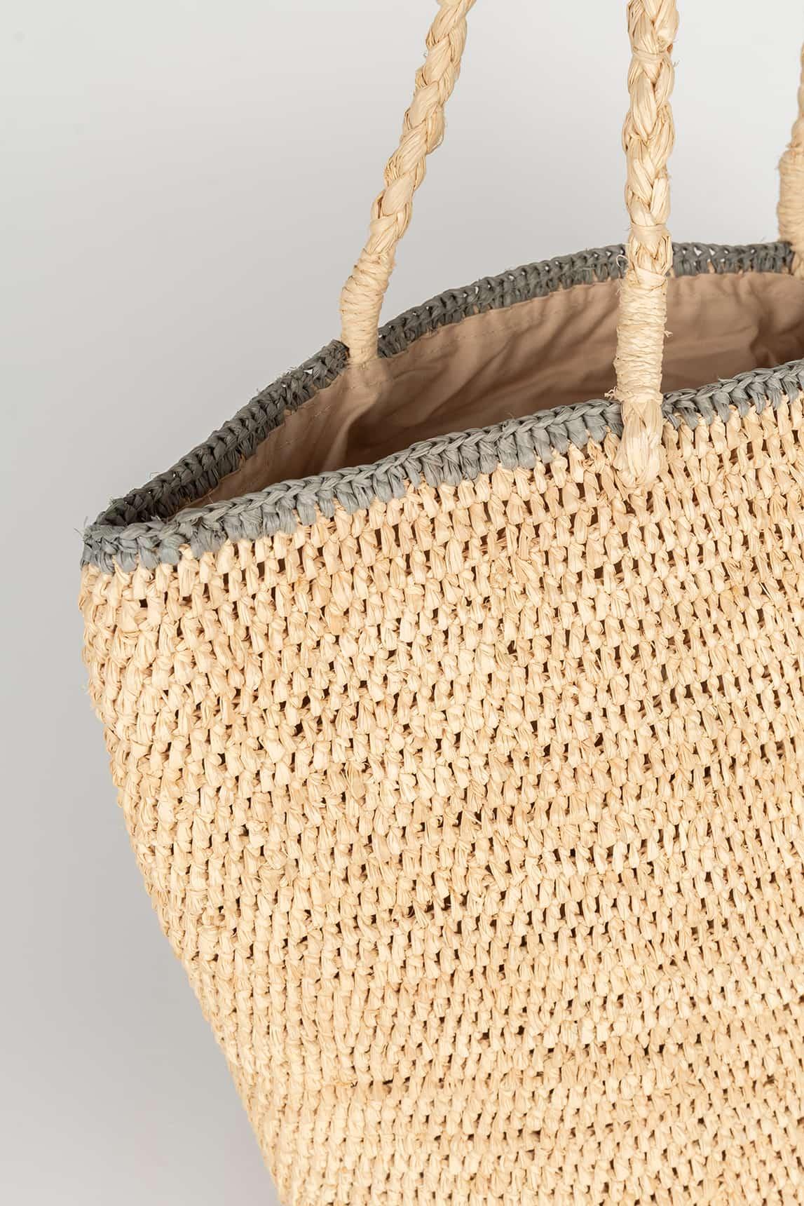 El contraste sutil en el borde superior en tono gris suave añade un detalle diferenciador que eleva el diseño sin restar versatilidad. Sus asas largas trenzadas permiten llevarlo cómodamente al hombro, ofreciendo una caída natural y cómoda para el uso diario.