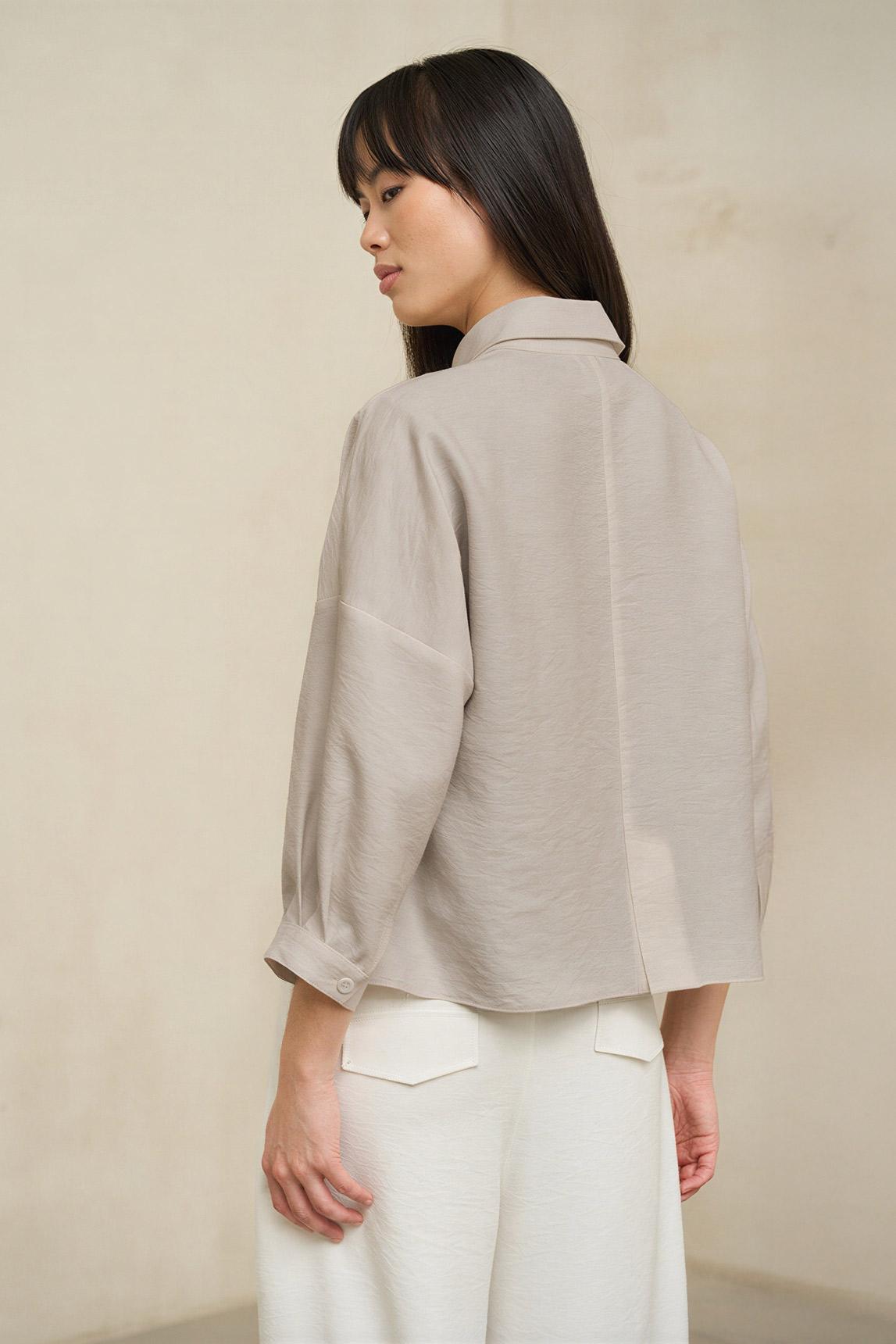 Camisa de mujer confeccionada en tejido ligero con textura arrugada natural. Incorpora cuello clásico, cierre frontal de botones al tono y bolsillos delanteros de parche que aportan equilibrio al diseño. Manga larga con caída suave y bajo recto, con una estructura fluida que acompaña el movimiento y ofrece un acabado ligeramente irregular.