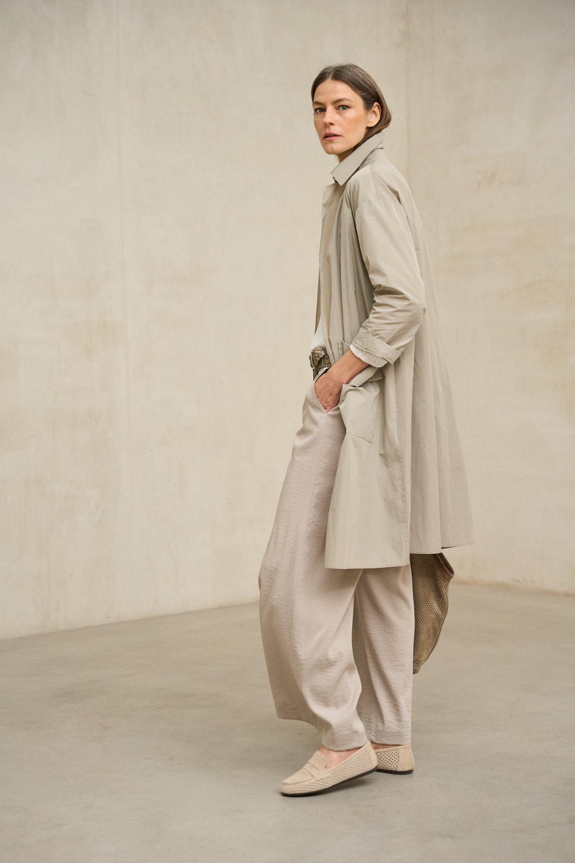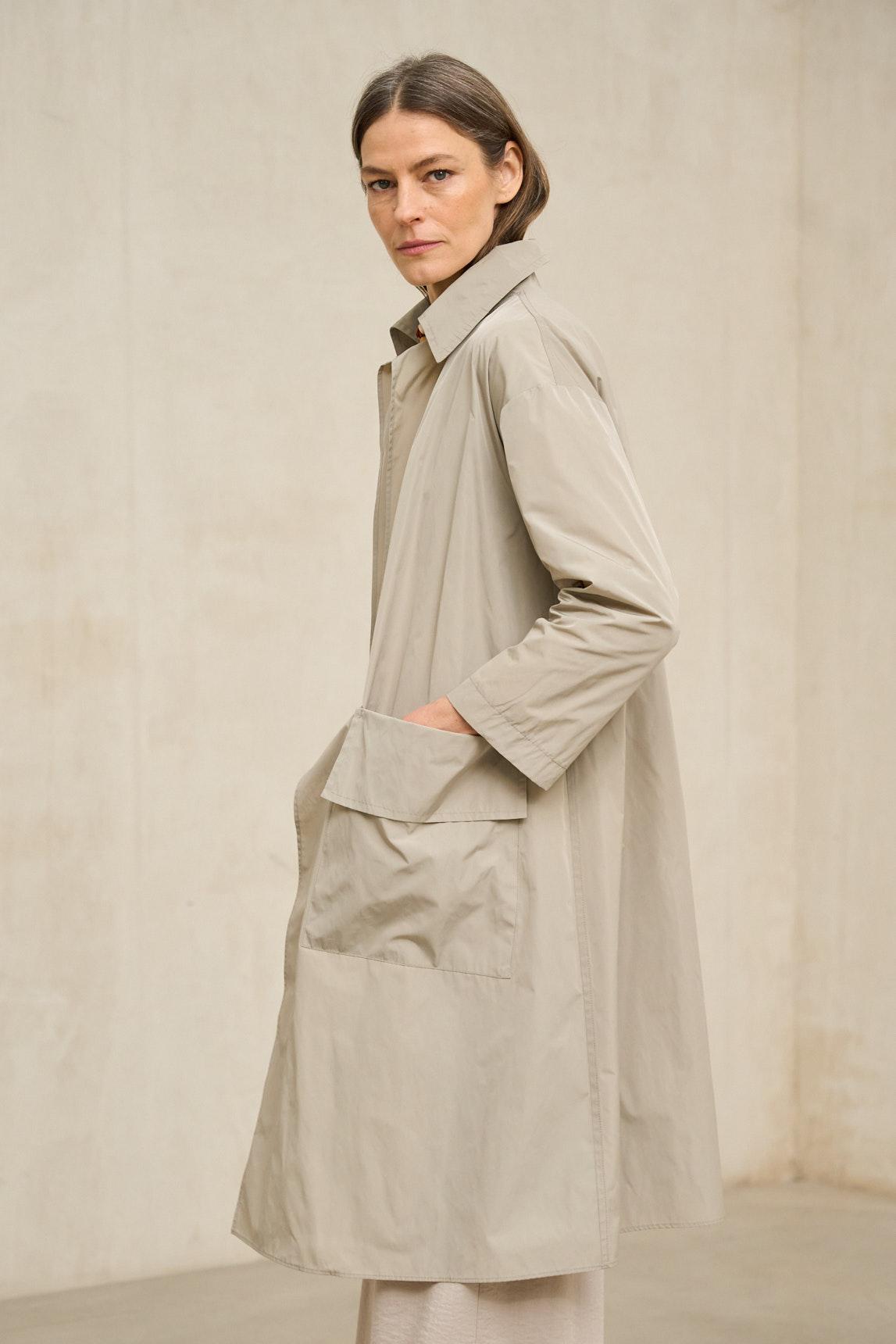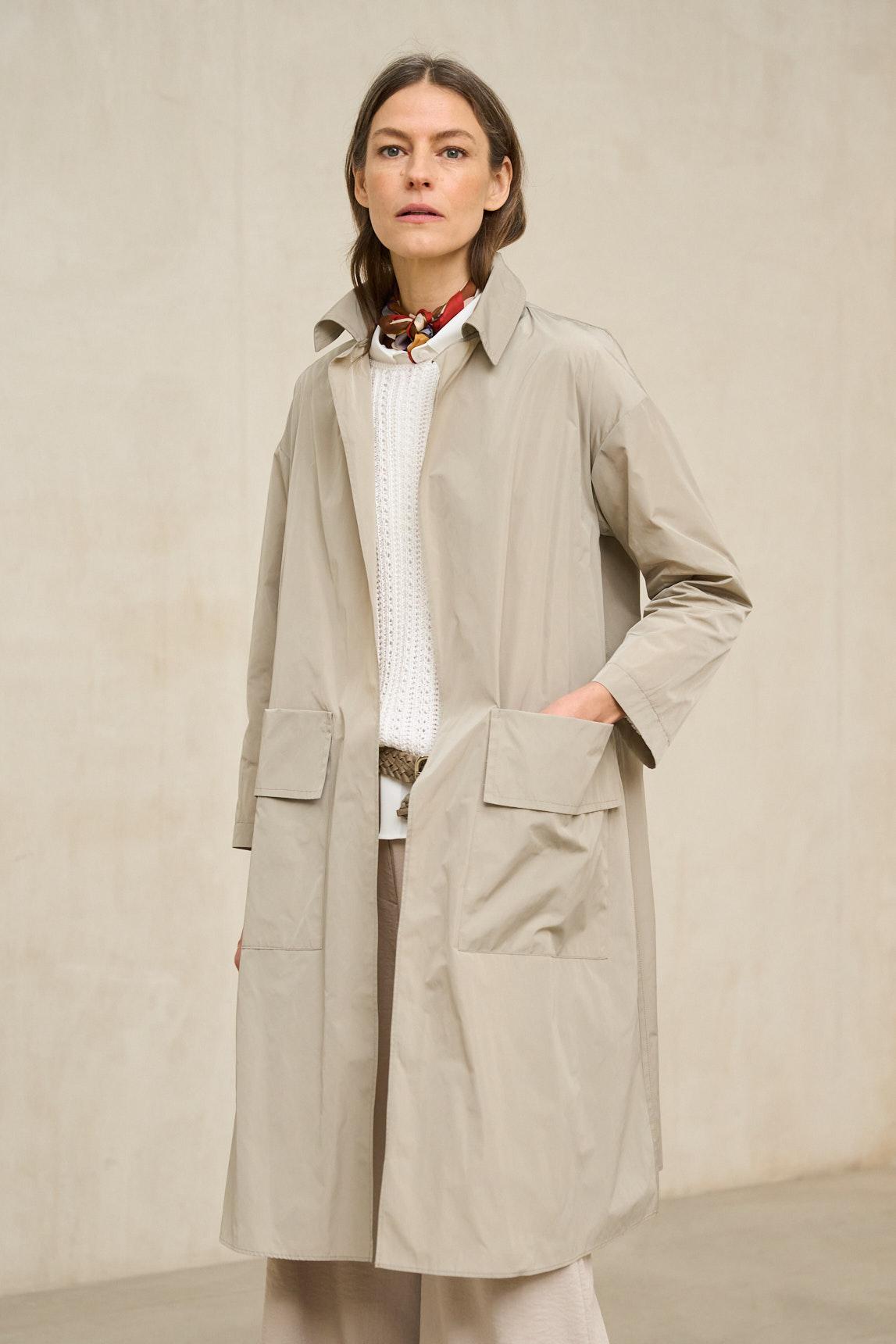 Esta gabardina ligera presenta una silueta recta y depurada, con largo midi que cae por debajo de la rodilla y estructura limpia desde los hombros. El diseño incorpora un cuello amplio y definido, mangas largas y un cierre frontal con cremallera centrada que queda integrada de forma discreta en el conjunto.