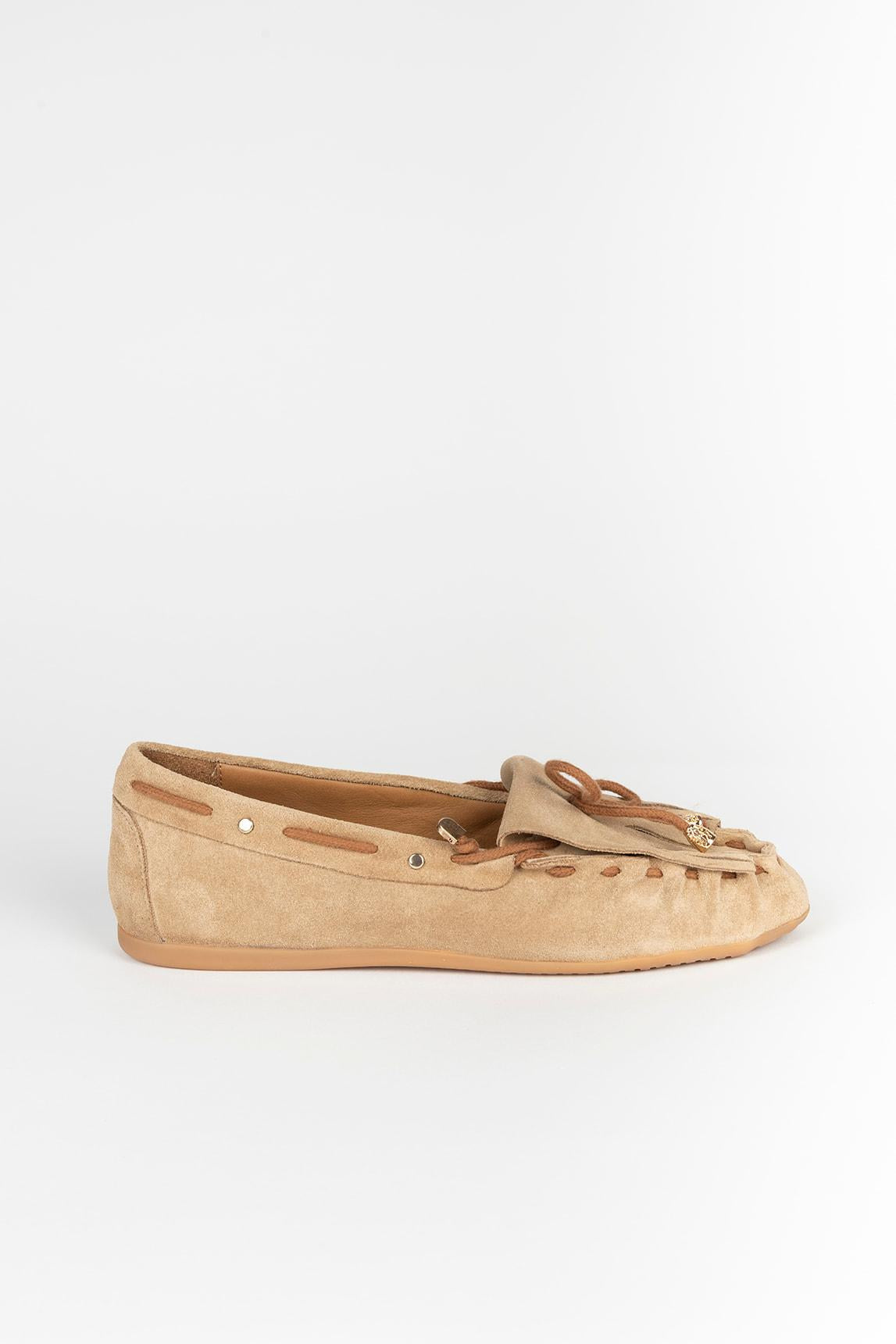 El mocasín Flecco arena reinterpreta el clásico mocasín con un diseño relajado y lleno de personalidad. Destaca por su detalle de flecos en el empeine y el lazo decorativo con terminaciones metálicas, elementos que aportan movimiento y un toque artesanal al conjunto.