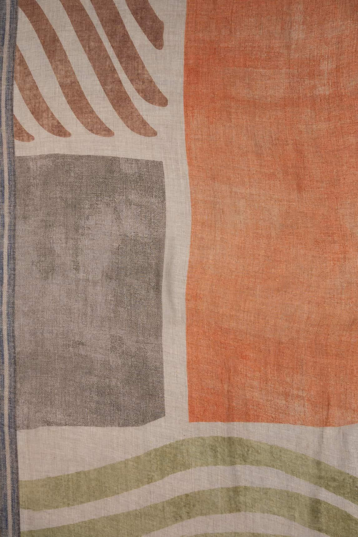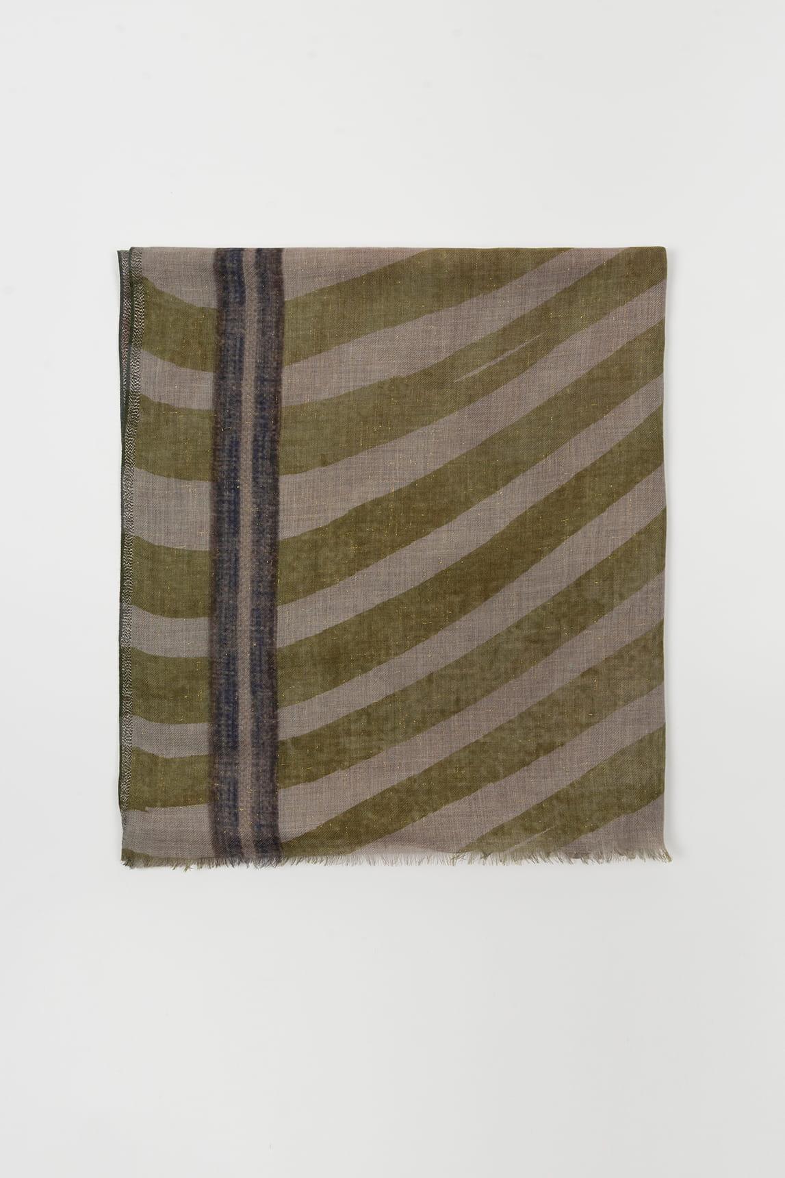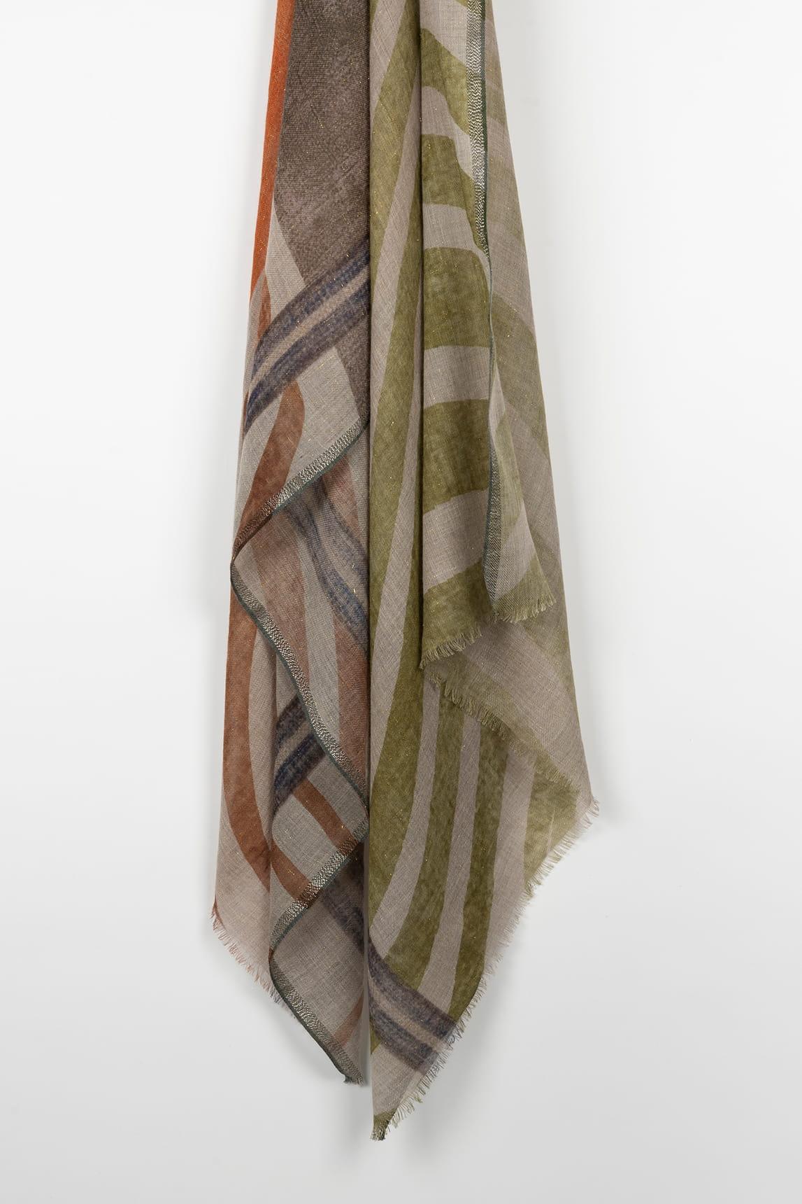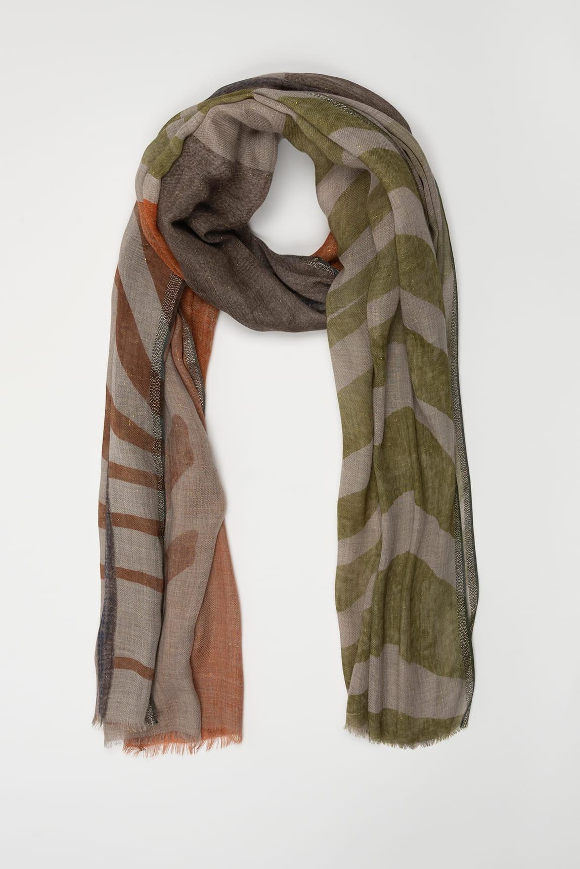 El Fular Arvian verde oliva y arena destaca por su combinación de líneas orgánicas y bloques suaves en una paleta natural y equilibrada. El contraste entre verde oliva, tonos arena y matices tierra crea un diseño armónico de inspiración contemporánea.
