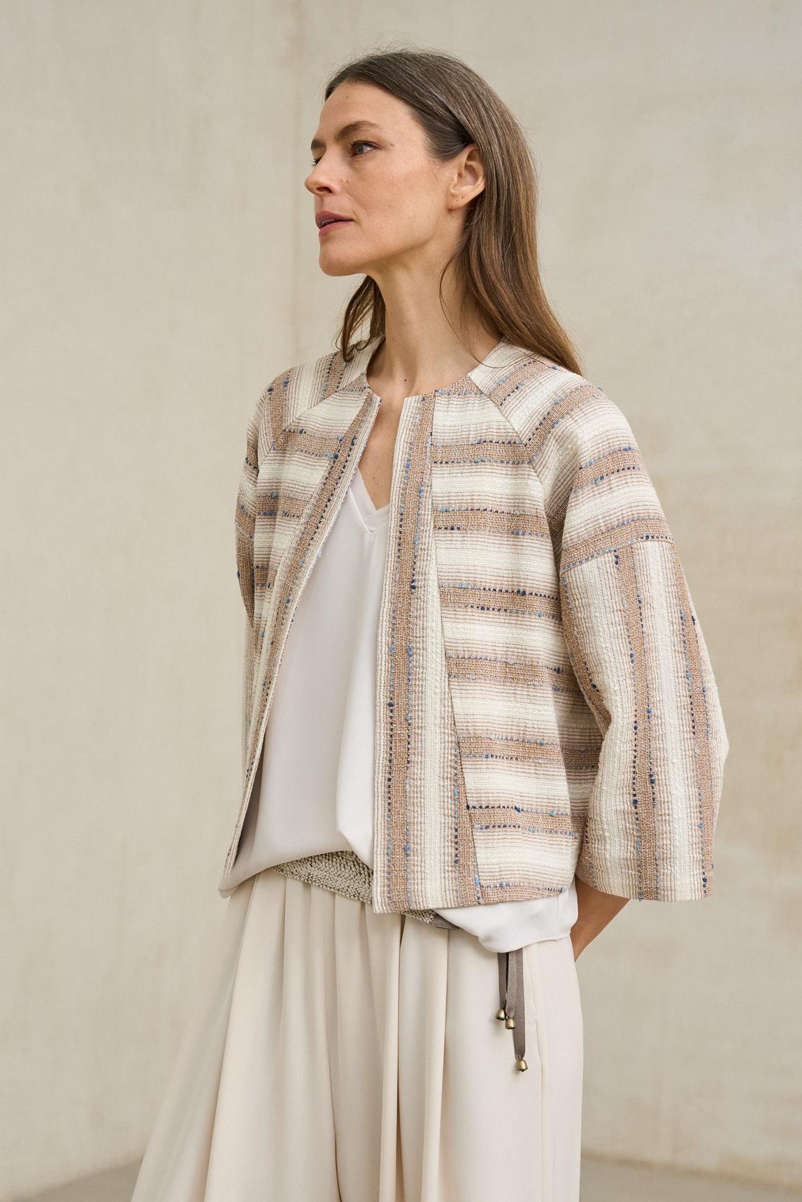 Chaqueta de mujer confeccionada en tejido de textura marcada con patrón geométrico en tonos beige y crudo, que aporta un efecto visual dinámico y artesanal. Presenta cuello redondo, cierre frontal con botones al tono y bolsillos de parche que refuerzan su carácter funcional. El corte recto y el largo a la cadera crean una silueta equilibrada, mientras que su estructura ligera permite superposición sin añadir rigidez.