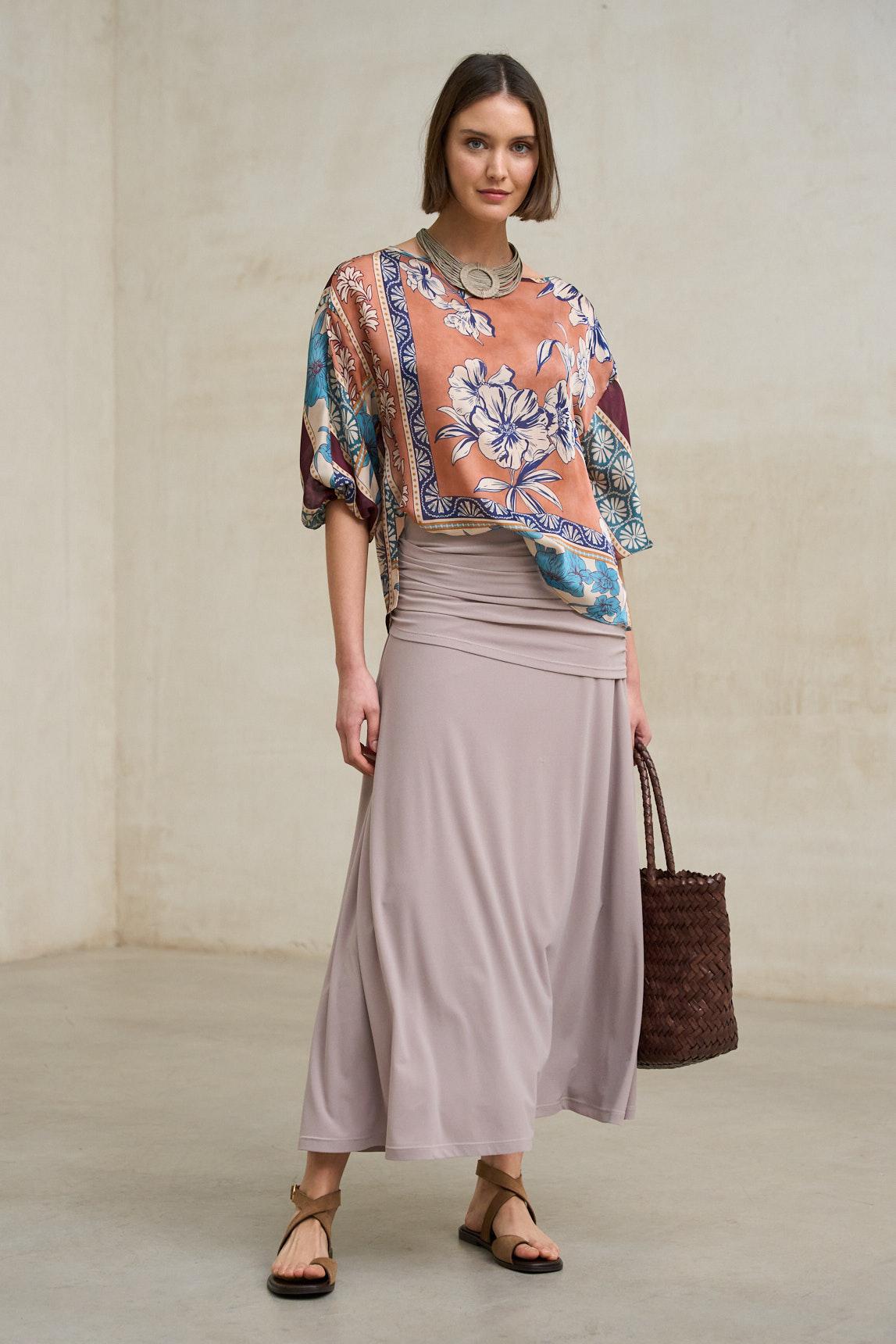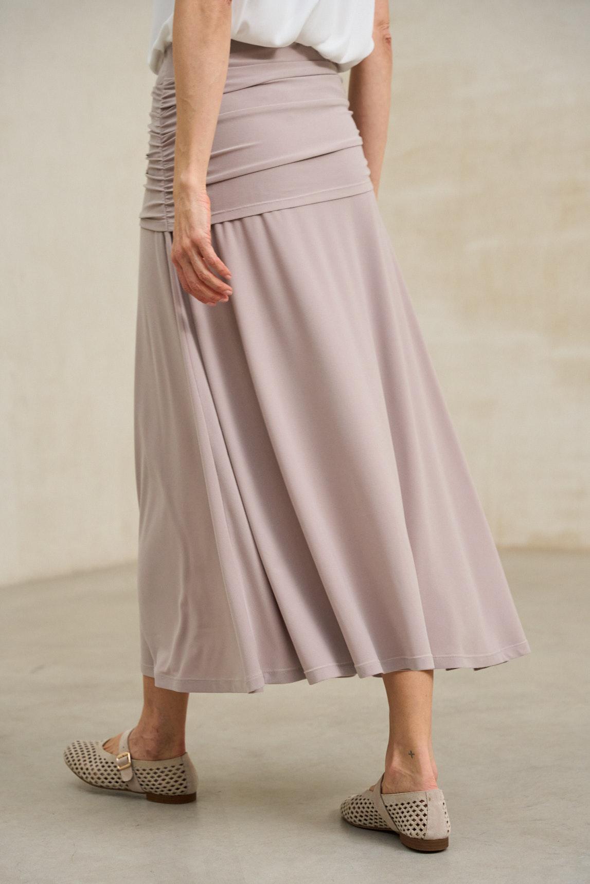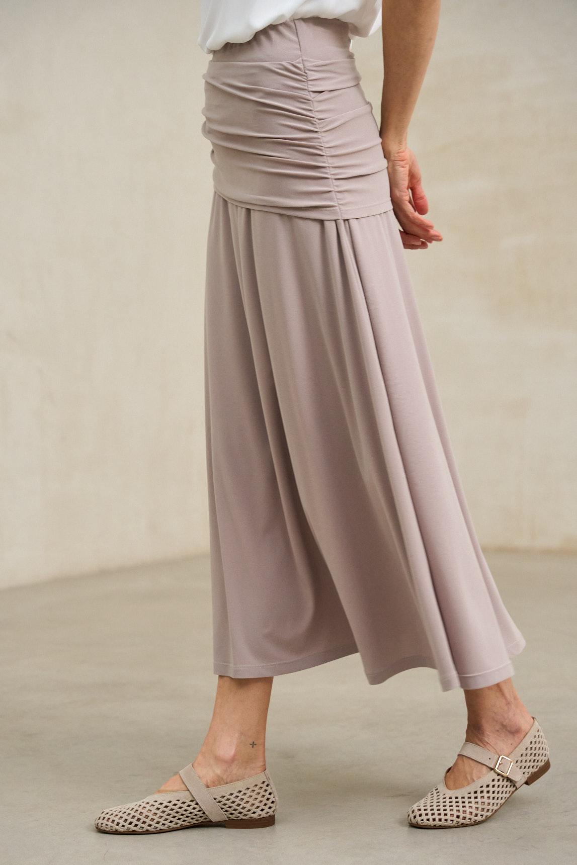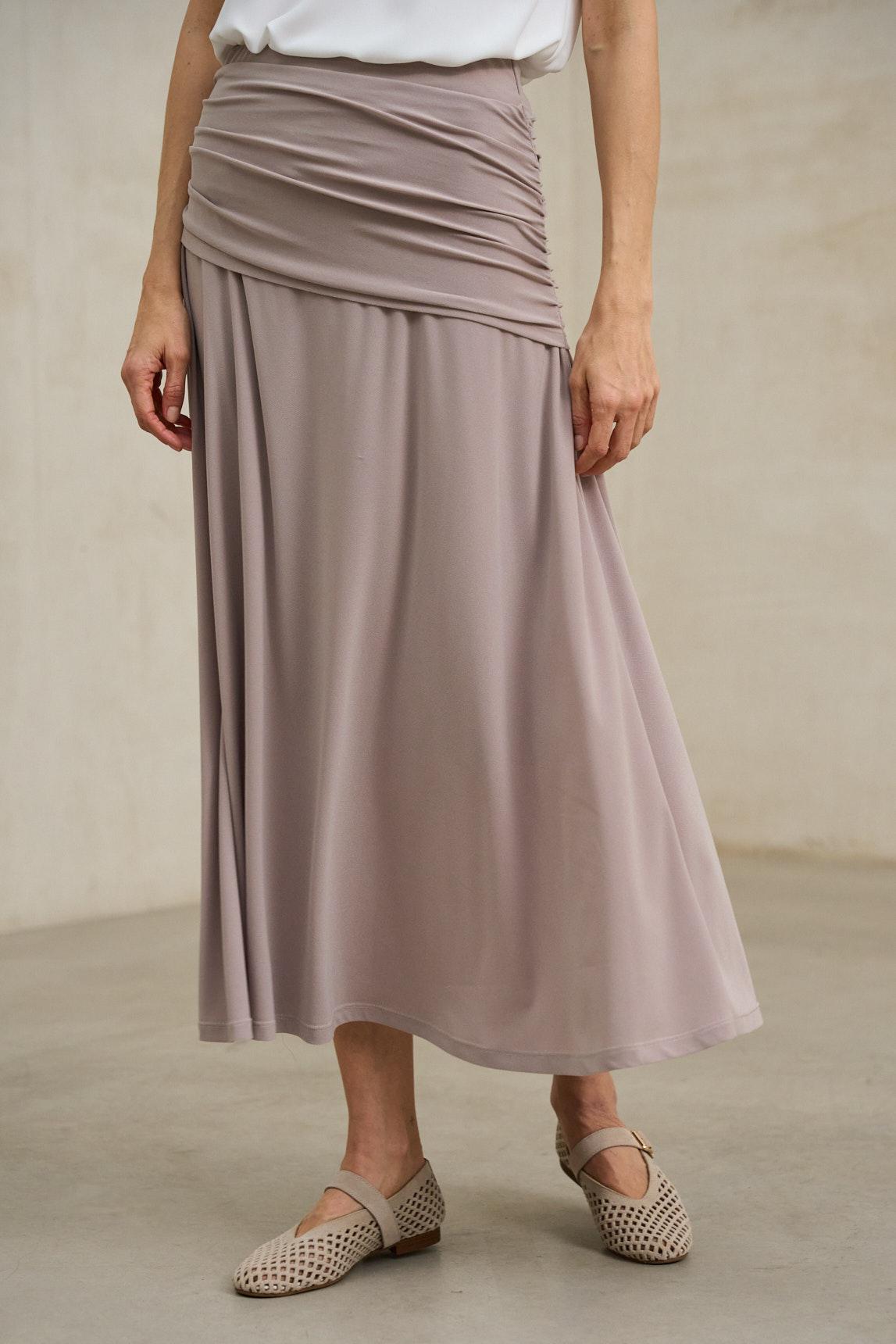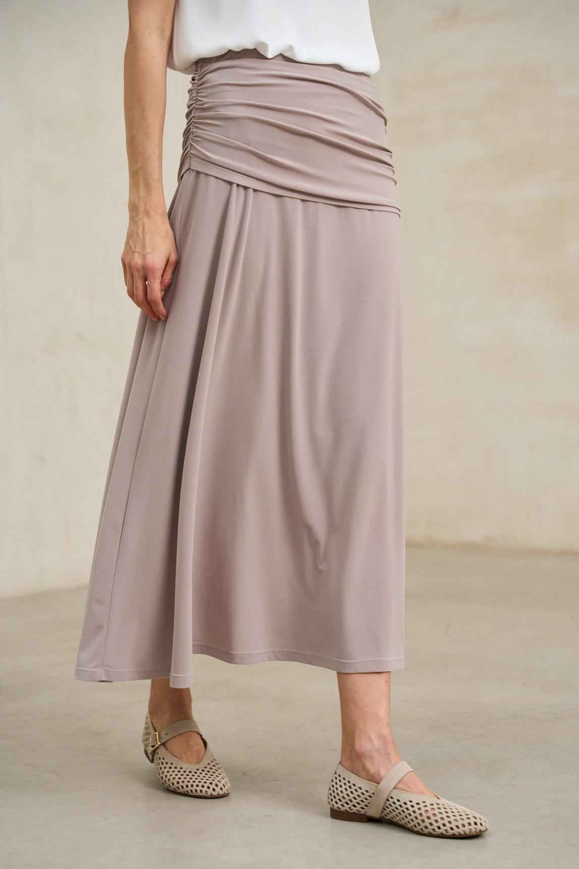 Falda de mujer confeccionada en tejido de punto fluido con un elegante efecto drapeado en la parte superior. Su cintura alta con banda ancha envuelve la silueta aportando comodidad y un ajuste favorecedor. El diseño largo y la caída suave del tejido crean un movimiento natural que realza su carácter sofisticado.