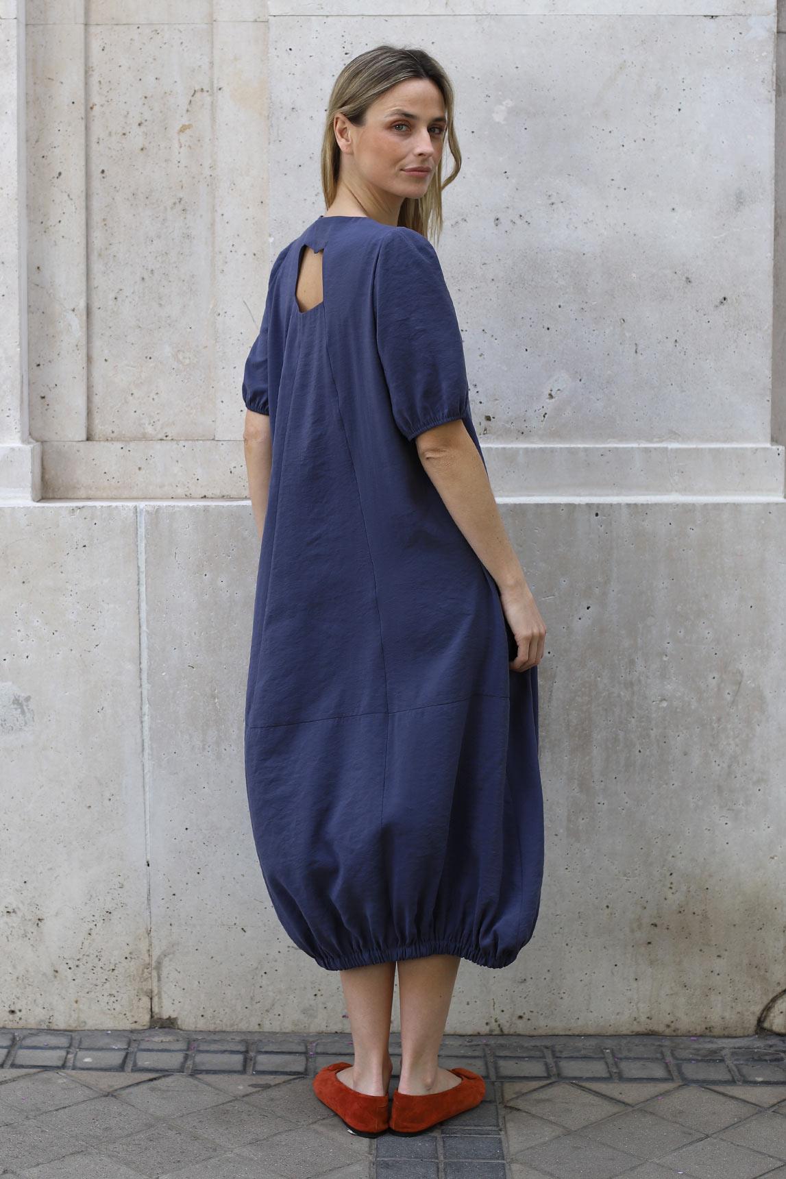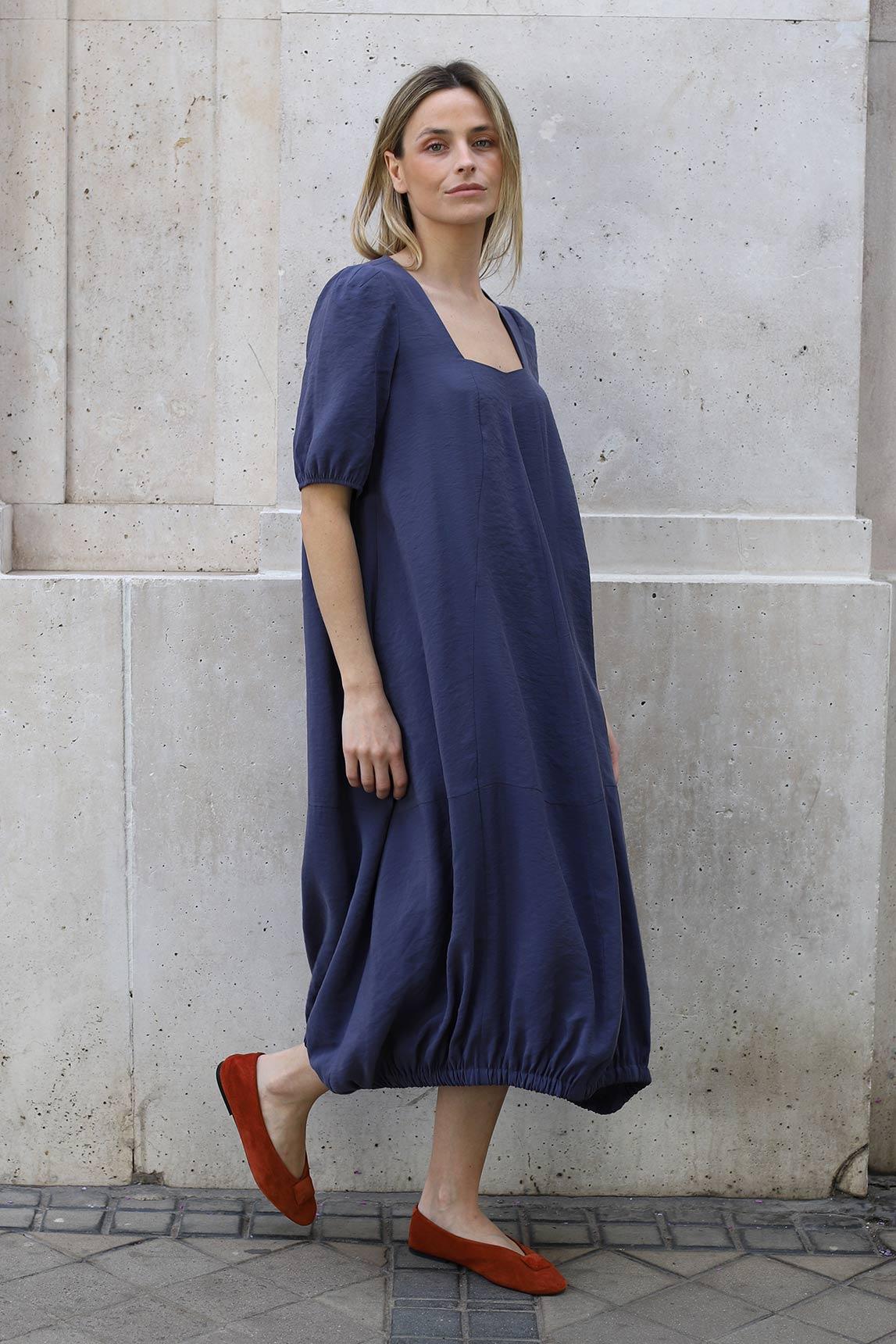 Vestido de mujer en color azul medio con escote cuadrado, manga corta amplia y silueta de volumen suave. El diseño presenta una línea limpia que cae con naturalidad desde el cuerpo y se recoge en un bajo globo con elástico, creando una forma envolvente, actual y muy favorecedora. Los bolsillos laterales integrados refuerzan su funcionalidad sin alterar la estructura depurada de la prenda, mientras la superficie lisa aporta una imagen serena y contemporánea.