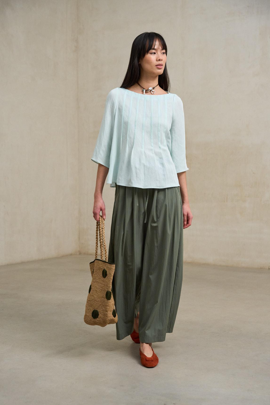 El tejido, de aspecto ligeramente texturizado, refuerza su carácter liviano y la convierte en una opción ideal para primavera y verano. El tono azul claro aporta luminosidad y un matiz fresco que combina especialmente bien con blancos rotos, crudos, arena o verde oliva. Es una pieza versátil que funciona tanto con pantalones amplios como con faldas fluidas para un look equilibrado y contemporáneo.