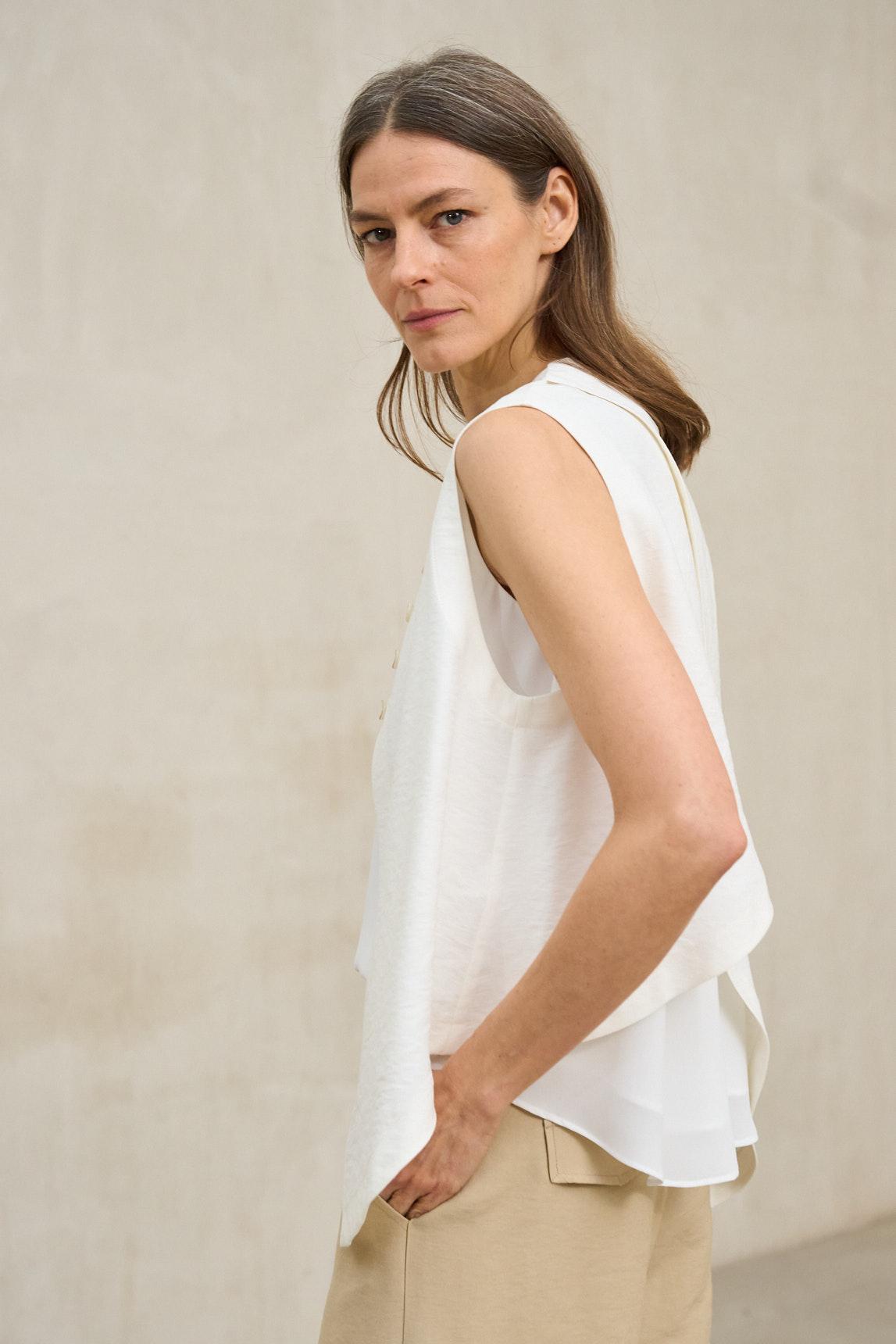 Chaleco de mujer confeccionado en tejido con textura arrugada de aspecto natural. Diseño sin mangas con cuello redondo, cierre frontal con botones al tono y bolsillos de plastrón que aportan funcionalidad al conjunto. La estructura amplia y el bajo asimétrico crean una silueta fluida y favorecedora.