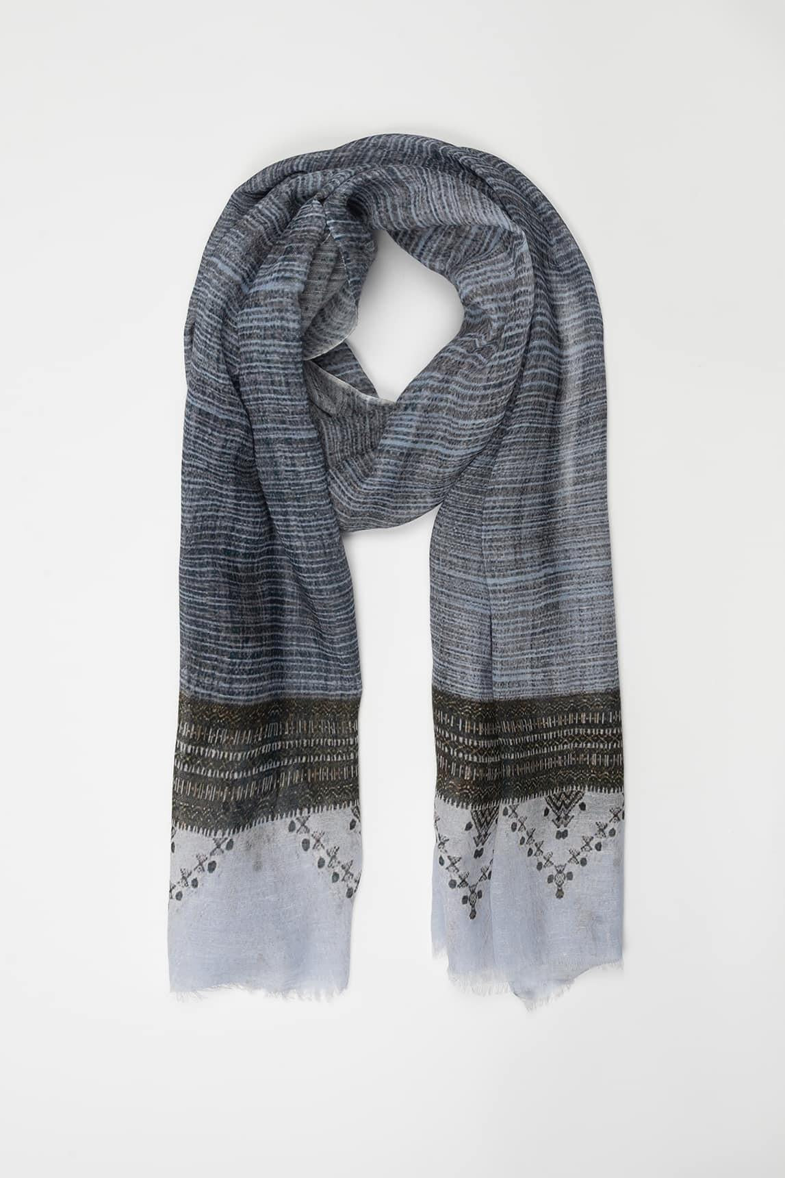 El Fular Eryon azul grisáceo destaca por su diseño geométrico sutil en una paleta fría y elegante. La superposición de líneas y tramas crea un efecto visual delicado que aporta profundidad sin resultar recargado.