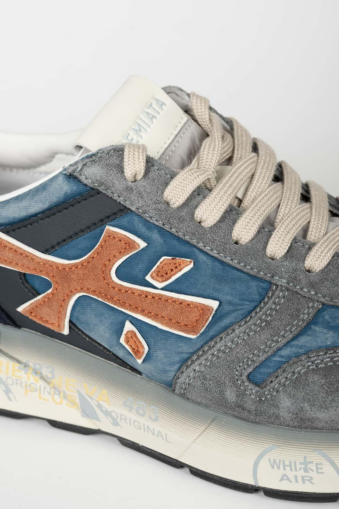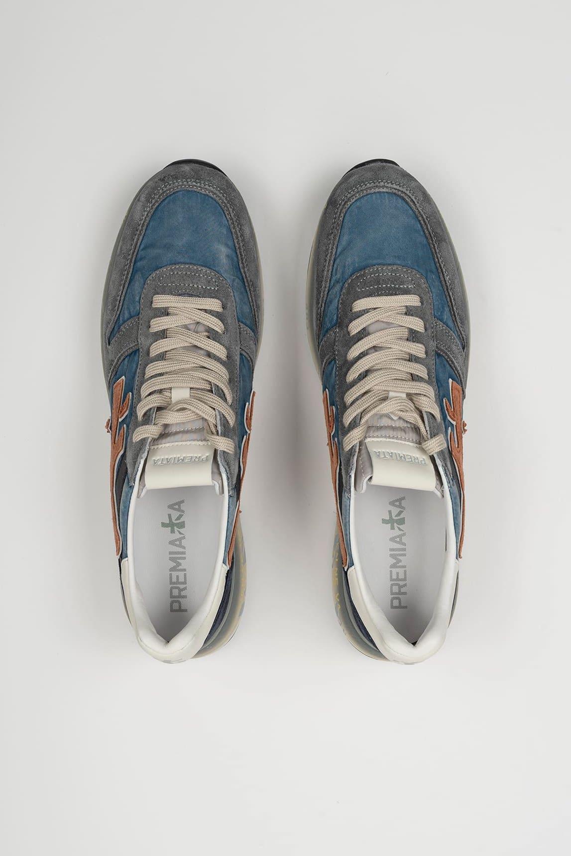 Las zapatillas Premiata Mick 7215N reinterpretan el estilo runner clásico en una combinación de azul, gris y matices neutros que aportan profundidad y equilibrio visual. Su estructura mezcla ante y tejido técnico, creando un juego de texturas distintivo.
