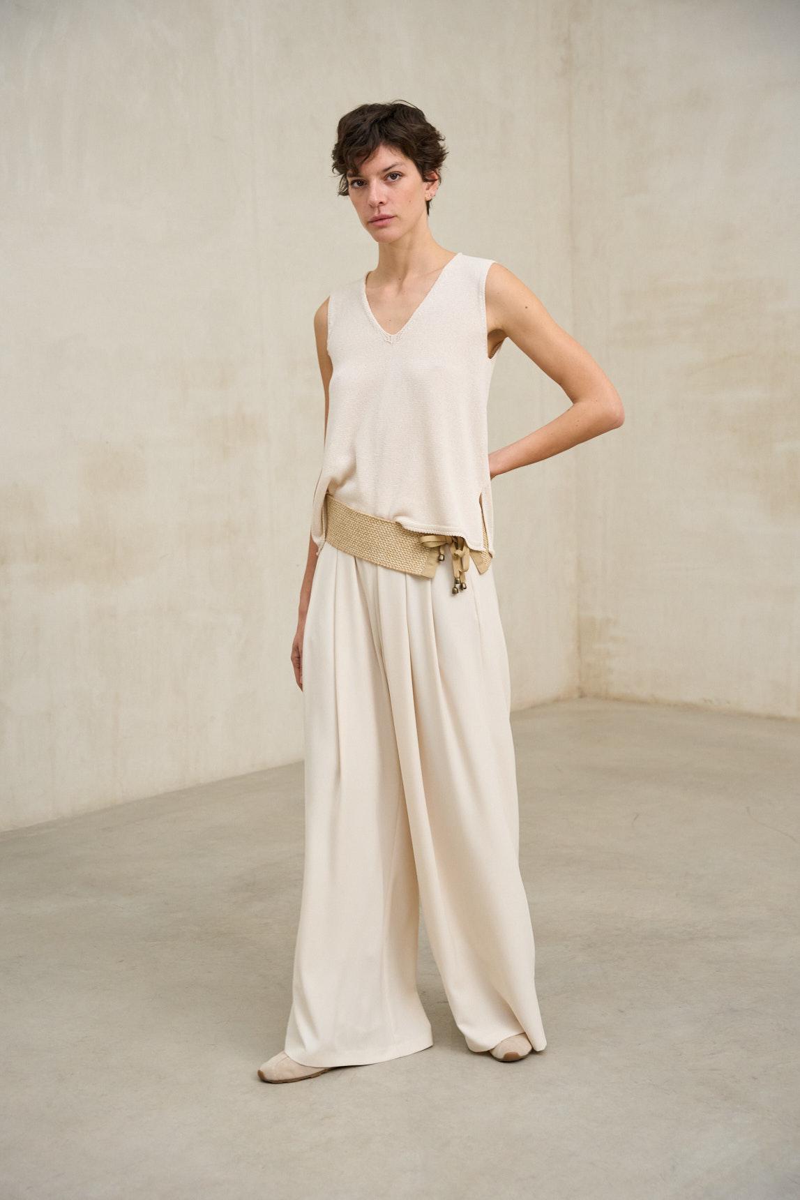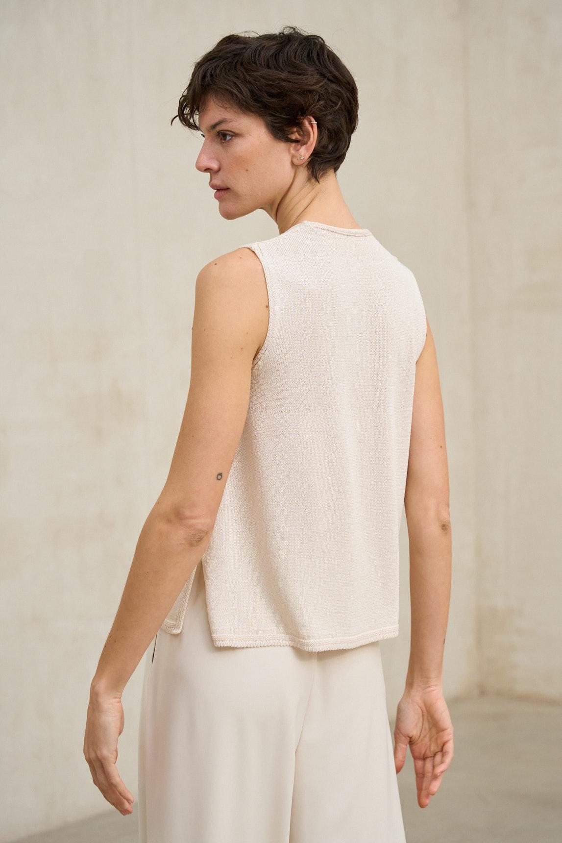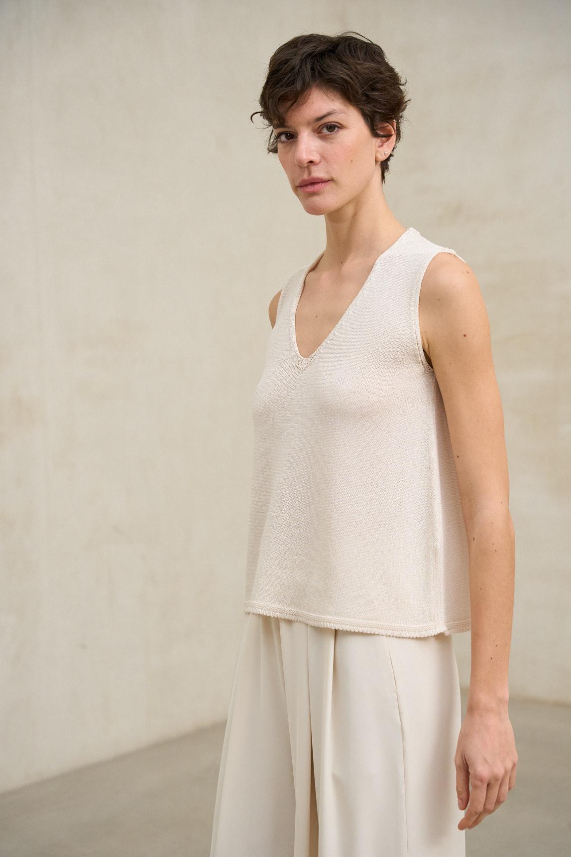 El tono crudo, luminoso y neutro, lo convierte en una base perfecta para estilismos monocromáticos o combinaciones con tonos tierra, azul marino o arena. Ideal como top elegante sin mangas o blusa básica refinada para primavera y verano, el top de punto Virel crudo es una prenda fácil de integrar en un armario versátil y atemporal.