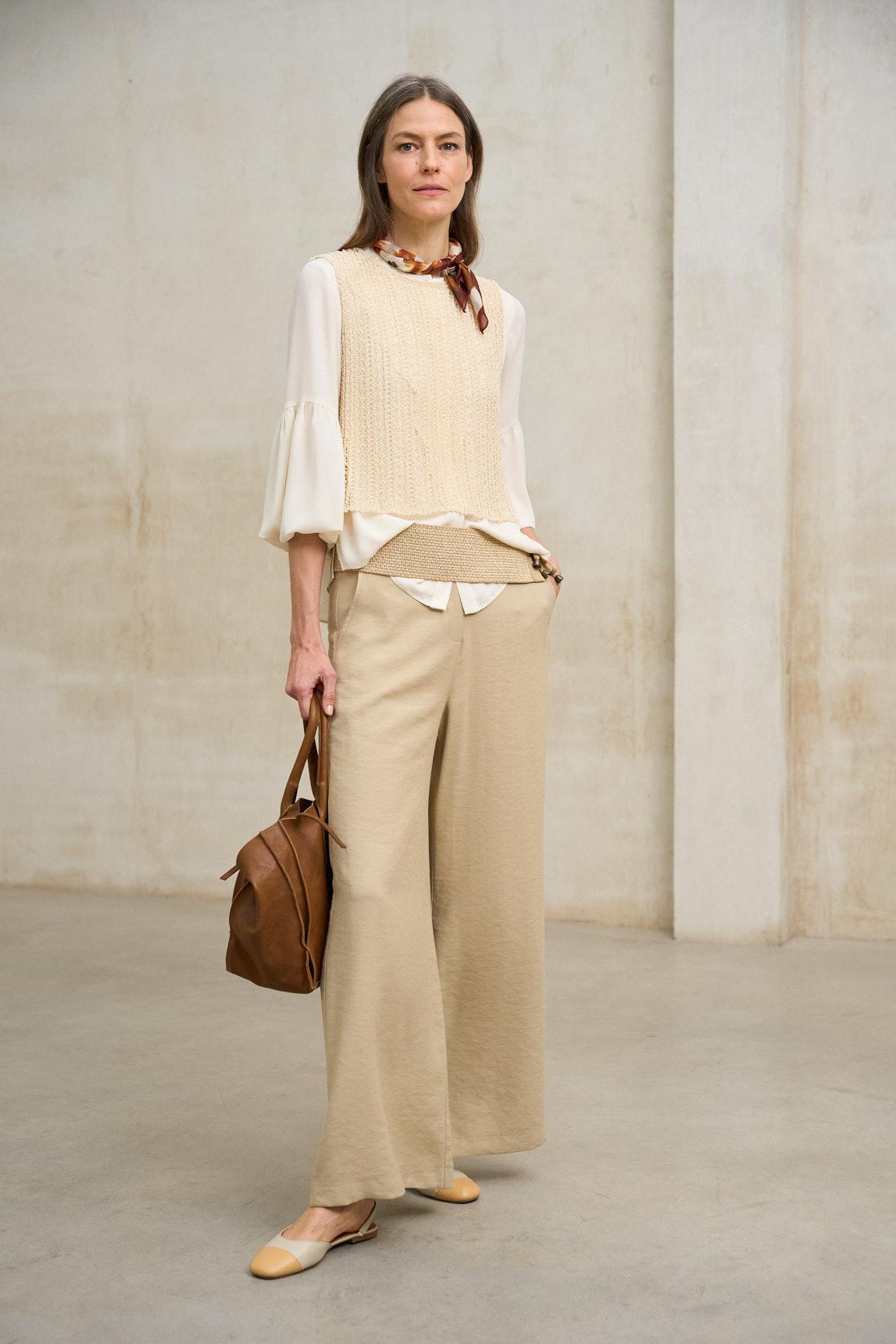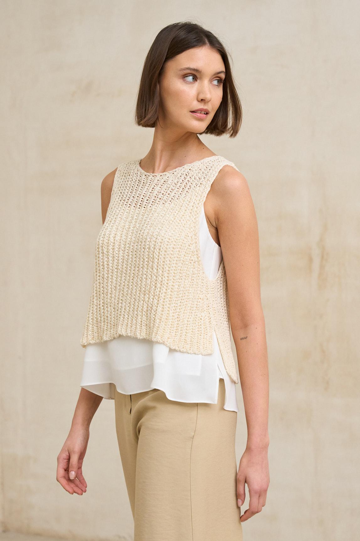 Para un acabado armónico, recomendamos combinarlo con el Top Alenia blanco roto (no incluido), que funciona como base perfecta bajo este tipo de tejidos abiertos. El tono crudo refuerza su versatilidad, permitiendo integrarlo en estilismos neutros junto a arena, beige, camel o verde oliva. Una pieza ideal para primavera y verano que aporta textura, ligereza y un aire artesanal refinado.