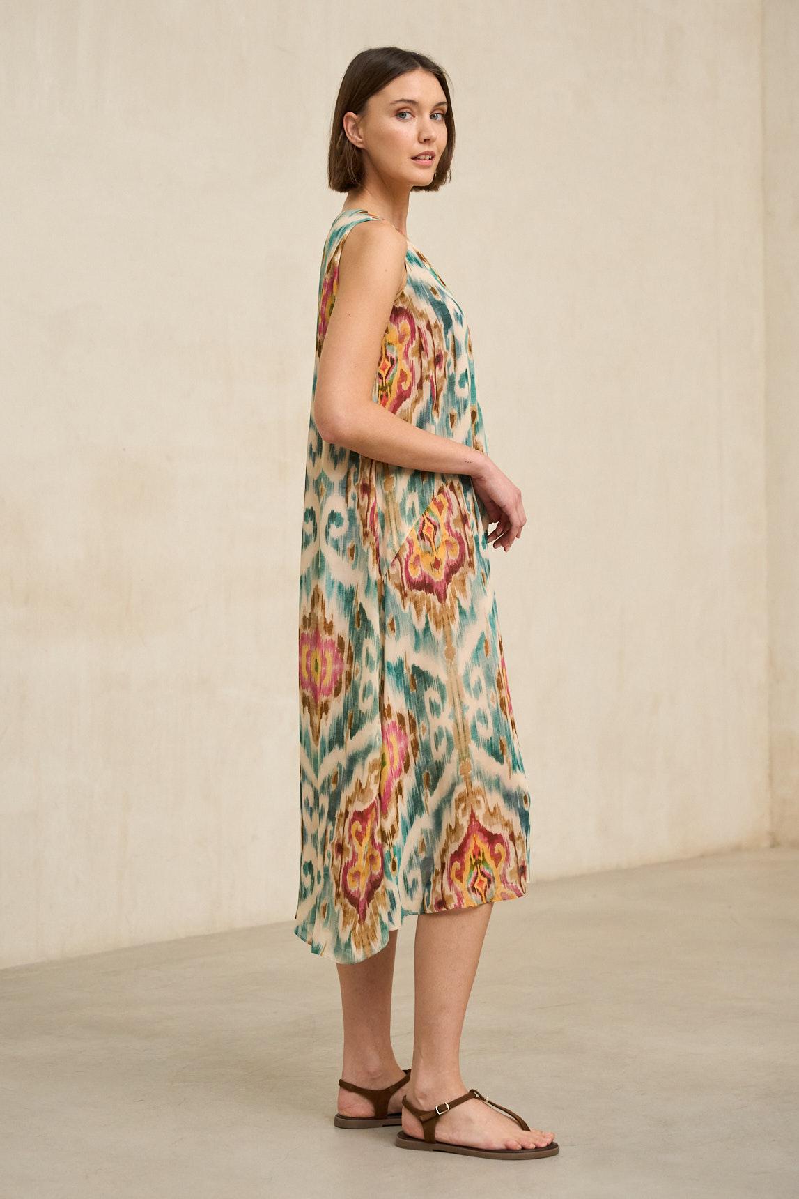El vestido Naïra estampado ikat mantiene la silueta fluida y el diseño minimalista que definen el modelo. Con escote en pico y corte sin mangas, presenta una estructura amplia que cae con naturalidad, creando movimiento y ligereza al caminar.