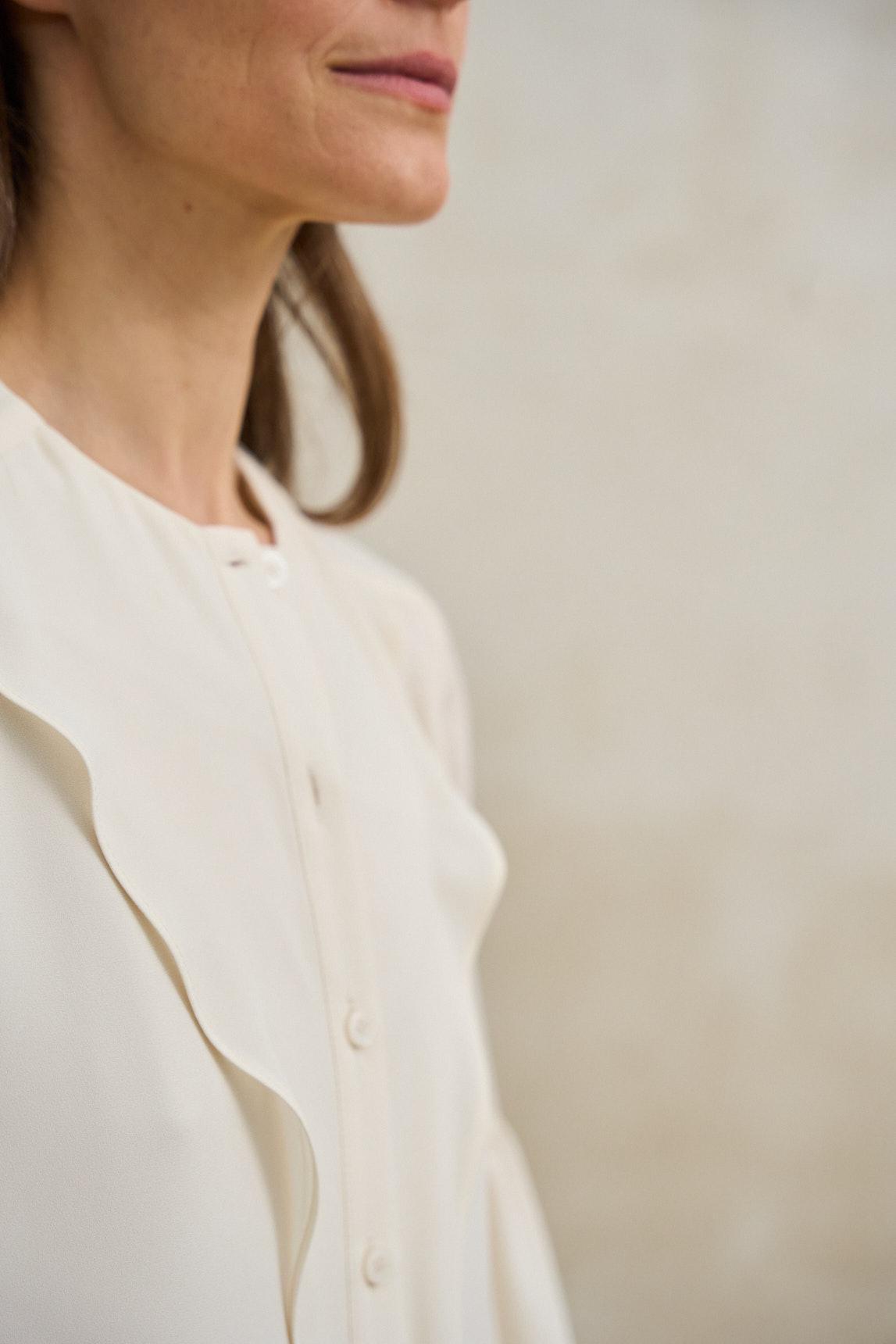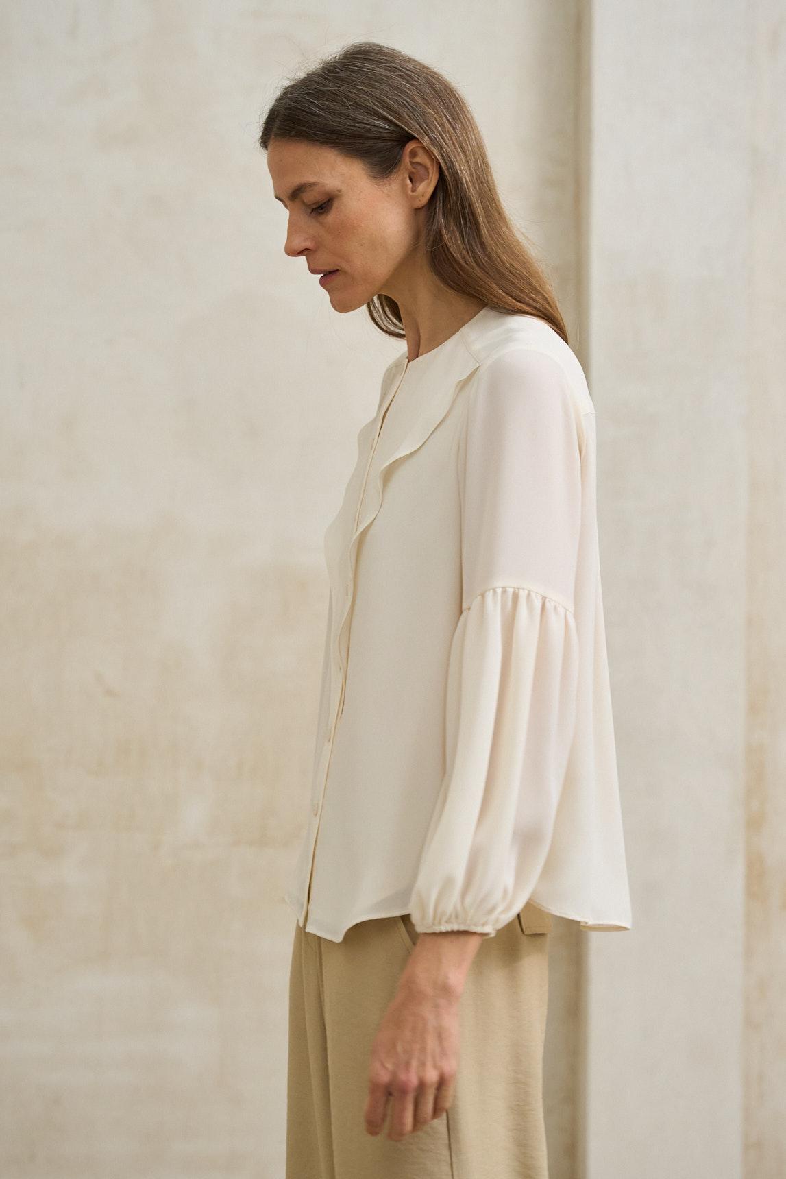 The Mireya off-white blouse is a light and delicate garment, crafted from a semi-sheer fabric that adds movement and subtlety to the design. Its fluid silhouette and soft drape create an elegant and feminine effect, ideal for bright and sophisticated outfits.