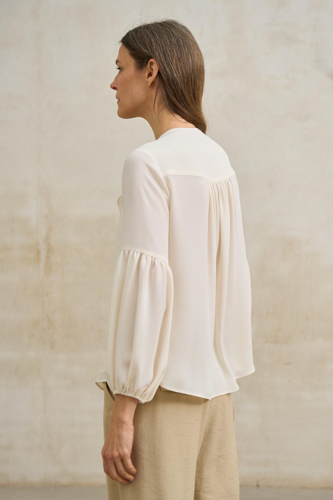 It features a rounded neckline and slightly puffed long sleeves with elastic cuffs, balancing volume and lightness. The translucent finish of the fabric adds visual depth and allows for layering; we recommend combining it with a T-shirt or top underneath for added coverage.