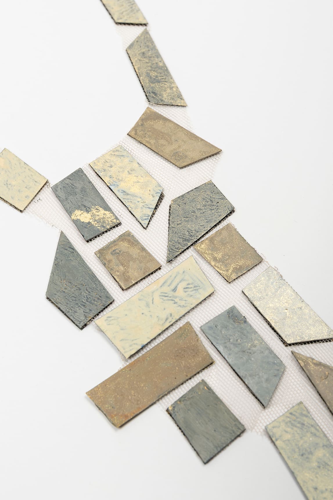 Geometrically inspired necklace with a fine chain and lobster clasp, accompanied by an adjustable extender and a small pendant. The body is composed of articulated rectangular pieces, arranged like a cascading mosaic, with a textured matte finish that alternates soft reflections between light and deeper tones, providing contrast and dimension.