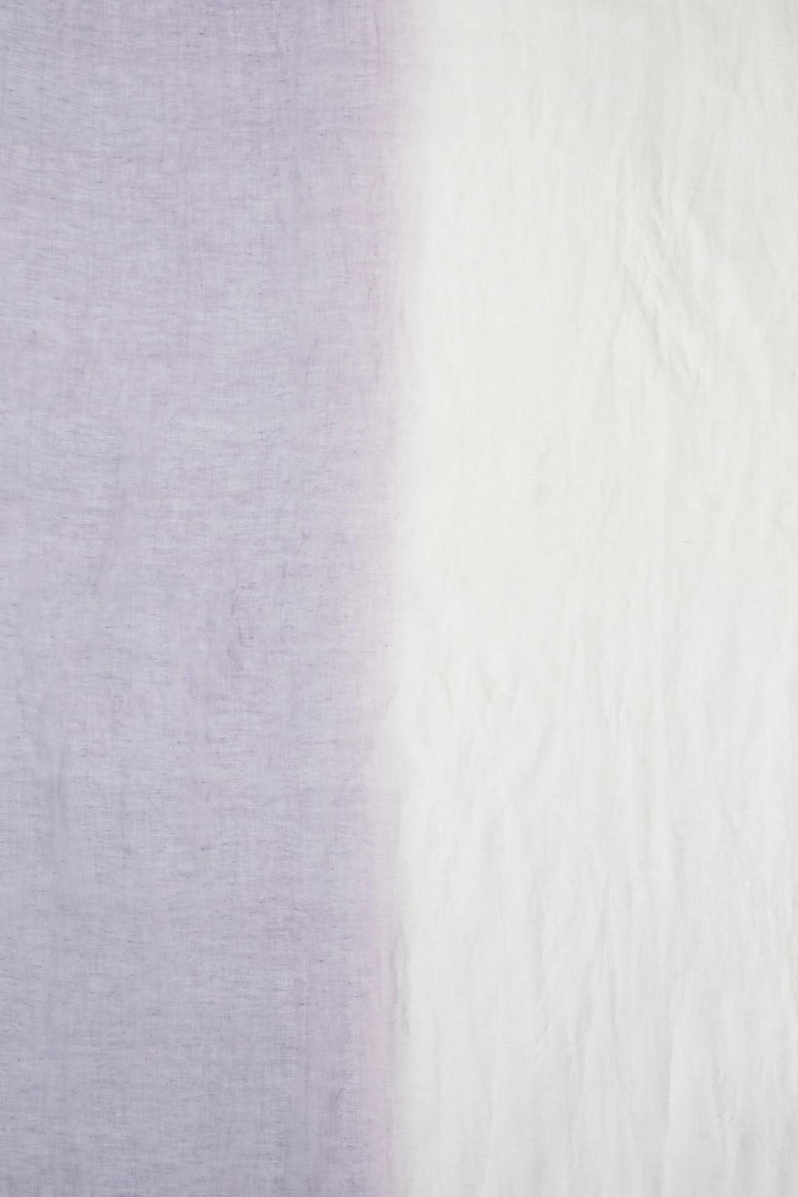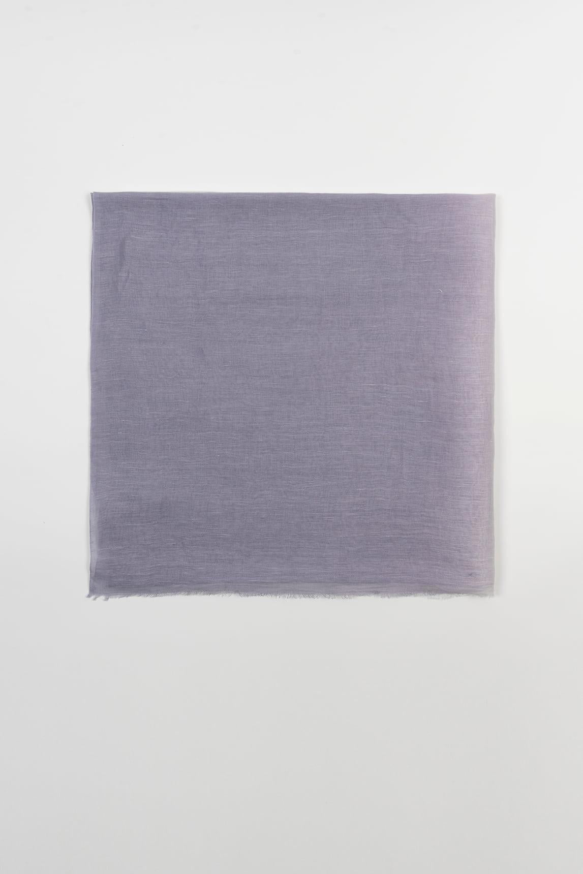 Women's scarf made from a natural blend of 70% linen and 30% cotton. Its light and airy fabric features a delicate gradient of lavender and white tones, with a slightly irregular texture characteristic of linen that adds a natural feel and movement. The frayed edges complete its handcrafted and relaxed finish.