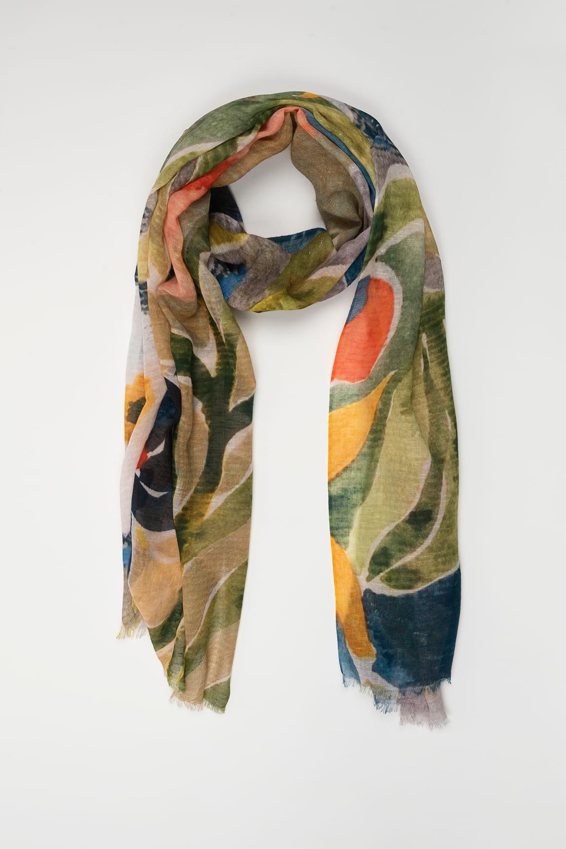 La combinación de verdes, mostaza y tonos arena lo convierte en un complemento ideal para looks neutros en crudo, beige o camel, aportando un punto de color equilibrado y sofisticado. El diseño floral de inspiración contemporánea suma personalidad sin resultar recargado.