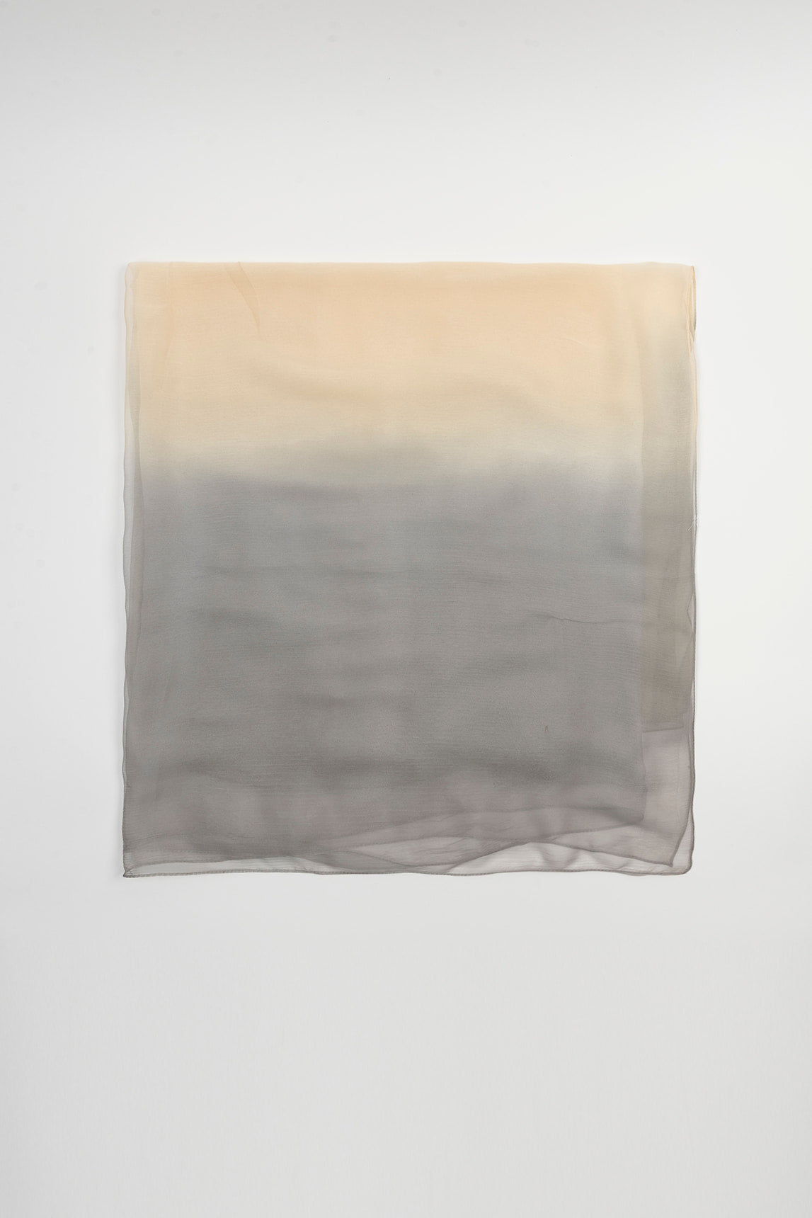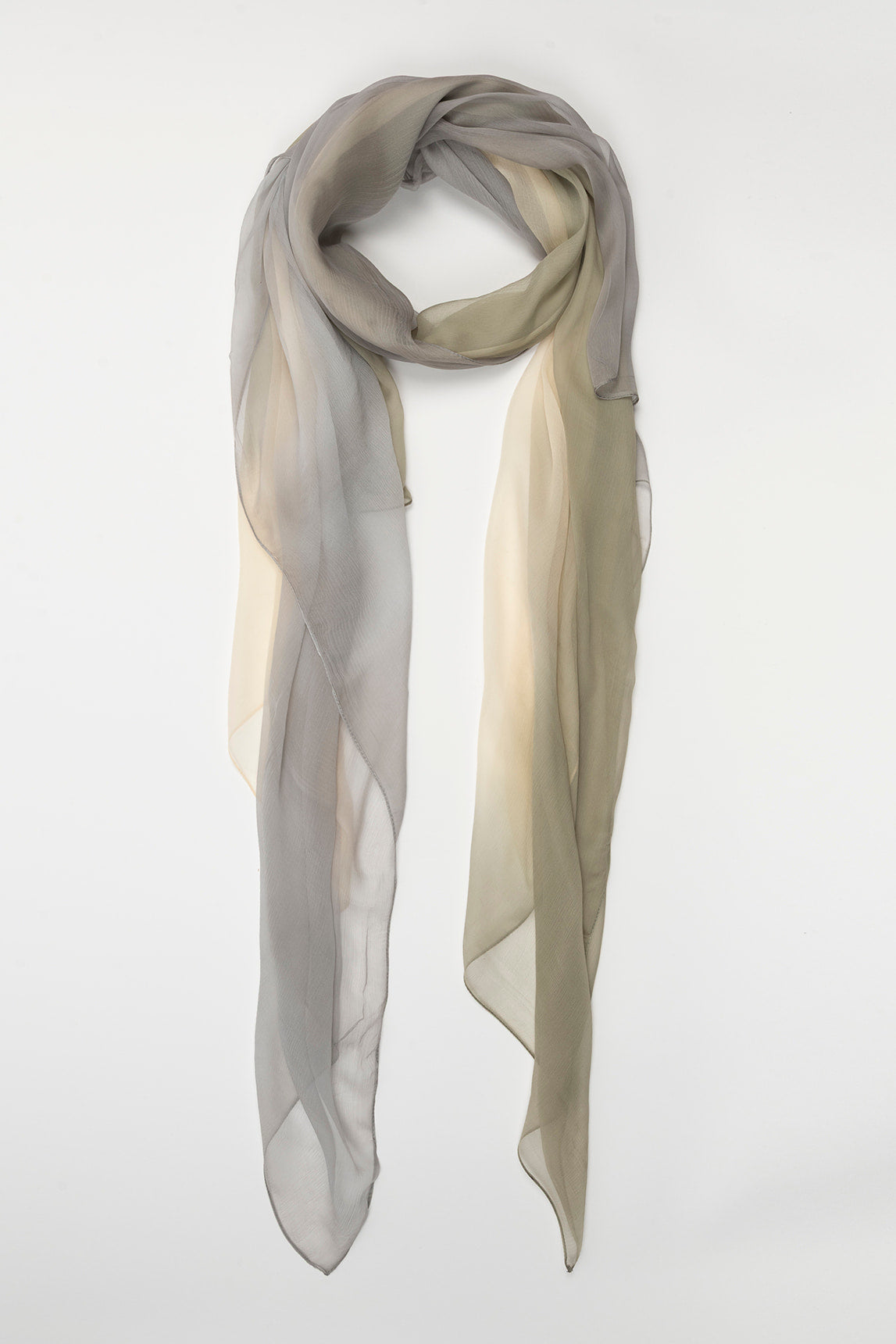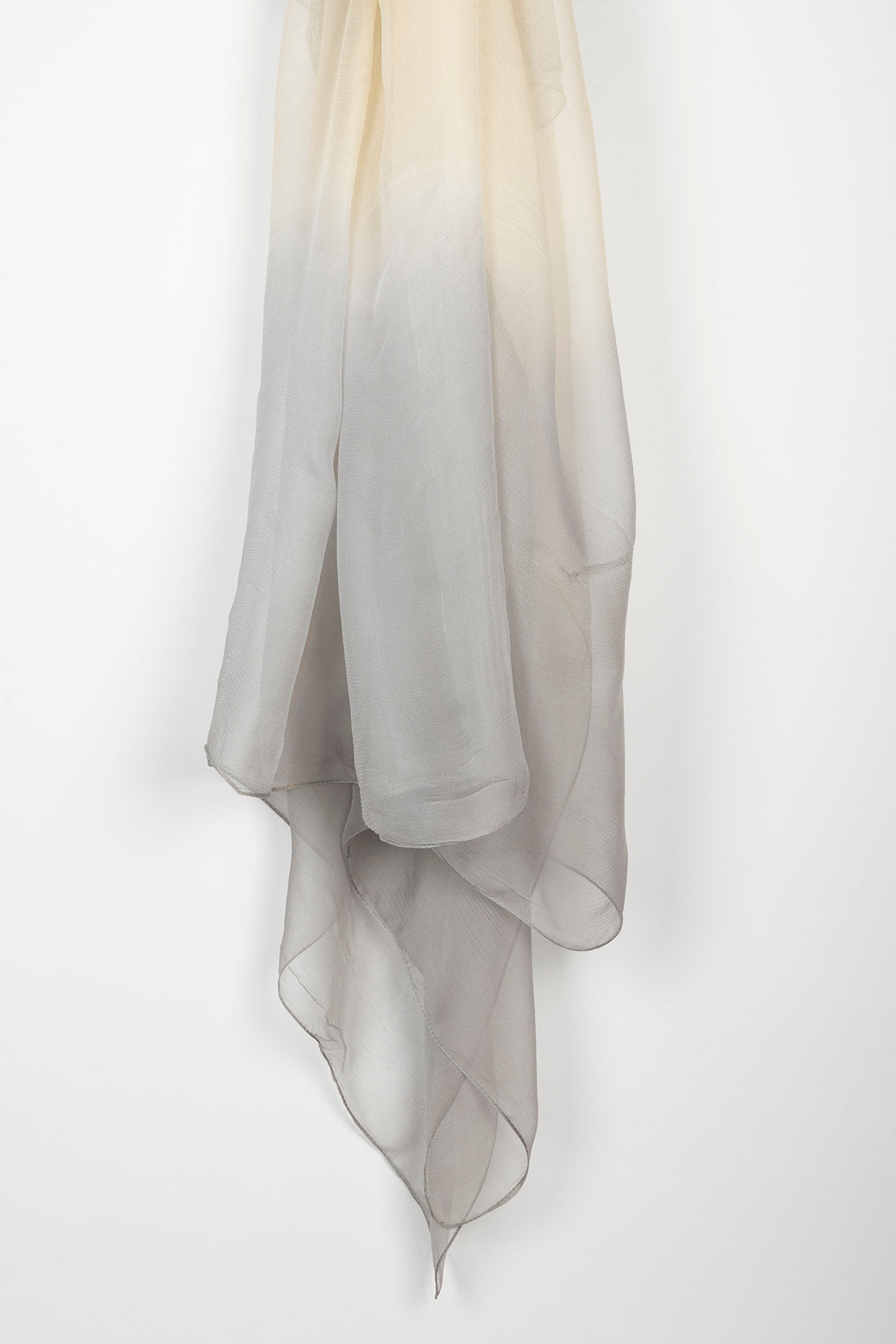 Women's scarf crafted from a lightweight, semi-sheer fabric with a soft, delicate finish. It features a gradient of gray and ivory tones that adds depth and luminosity to the design. Its flowing drape and finely finished edges enhance the understated elegance of the piece.