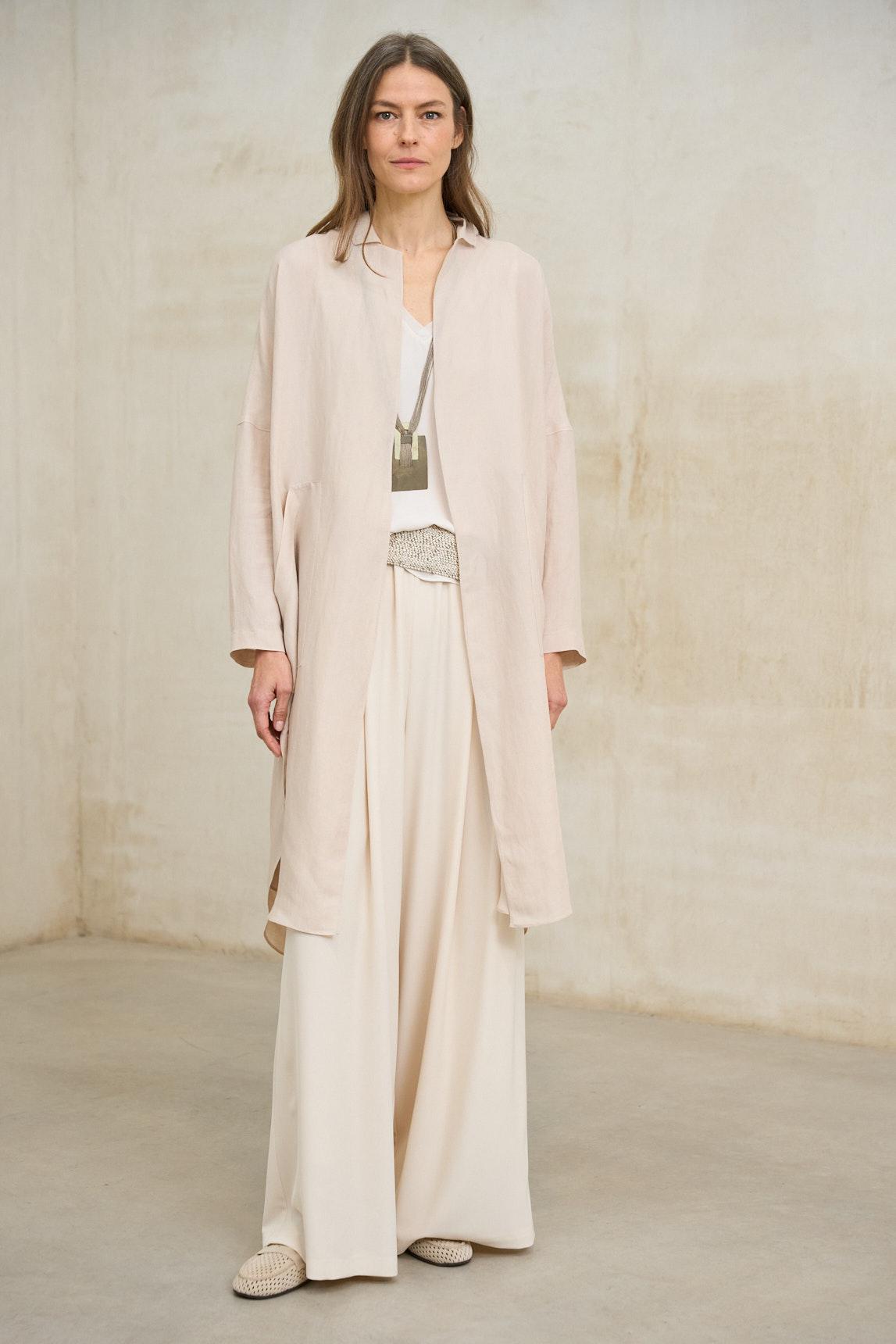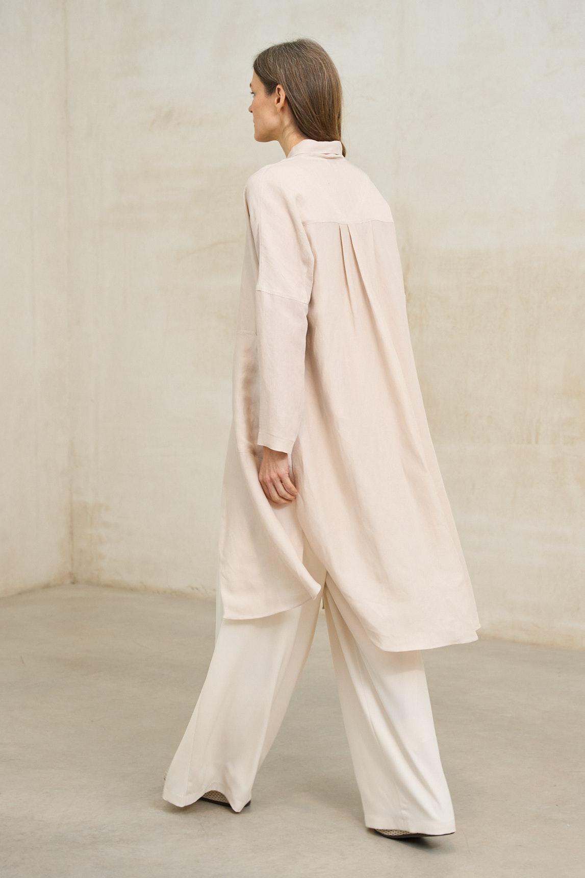 The Lirael dusty ecru frock coat is a lightweight garment with clean lines and a flowing drape, designed to complete elegant looks with a sophisticated and minimalist feel. Its open design, without a visible closure, allows the fabric to move naturally with you. With long sleeves and a slightly relaxed, straight cut, it easily adapts to dresses, flowing outfits, or wide-leg trousers, adding a subtle layer without detracting from the main look. The soft, lightweight fabric reinforces its versatility for transitional weather or special occasions. The raw, delicate, and luminous tone blends easily with monochromatic outfits or looks for weddings, communions, and special celebrations. It's a refined garment that balances elegance and comfort. We strive to display colors as accurately as possible, but they may vary slightly from reality.