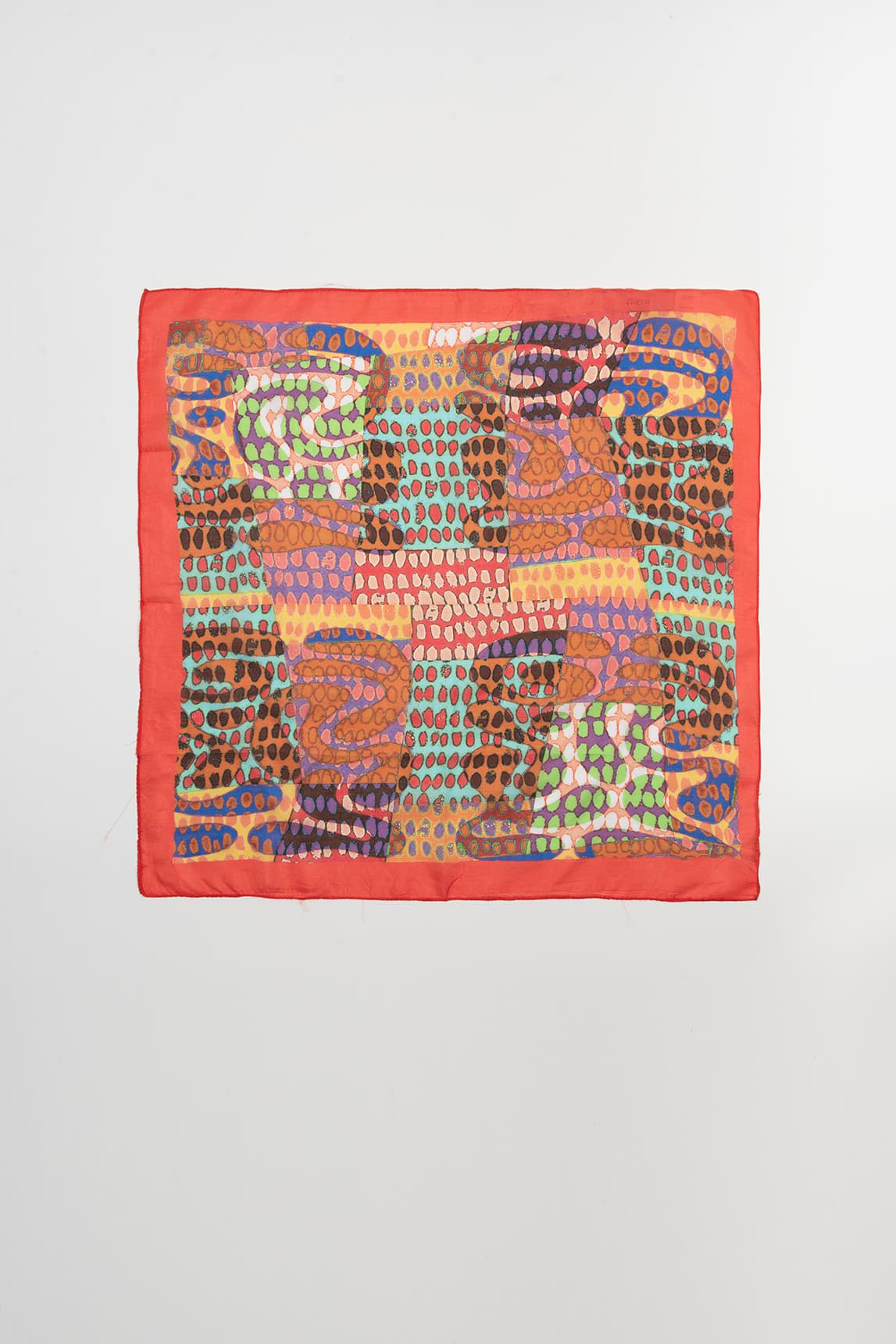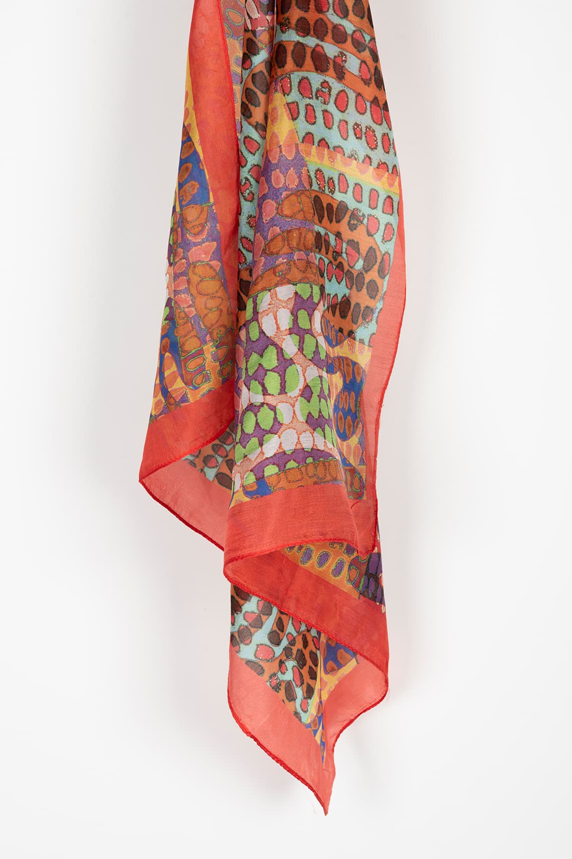 A light and airy scarf with a fluid drape and soft feel. It features an organic, animal-inspired print with polka dots and gradients in vibrant colors, framed by a wide coral border that defines the shape and adds contrast. The fine finish is ideal for tying without adding bulk.