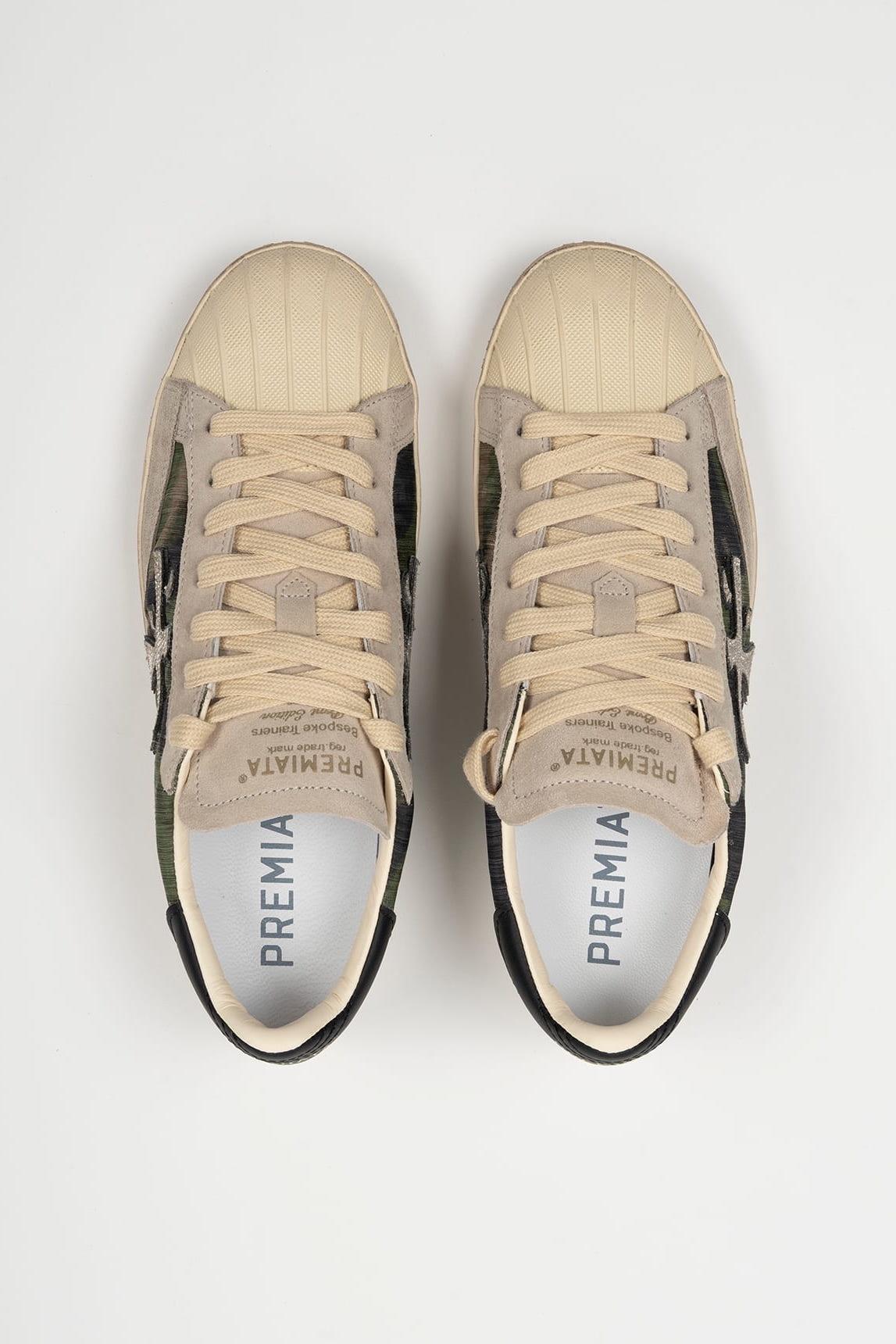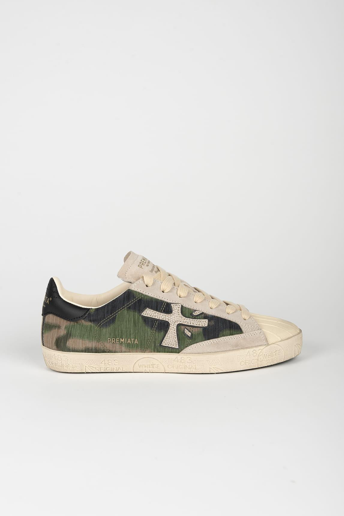 The Premiata Steven 8058 sneakers combine a white base with olive green details, creating a subtle contrast that adds character without sacrificing elegance. The silhouette maintains the clean and balanced essence of the Steven line, ideal for a refined urban style.