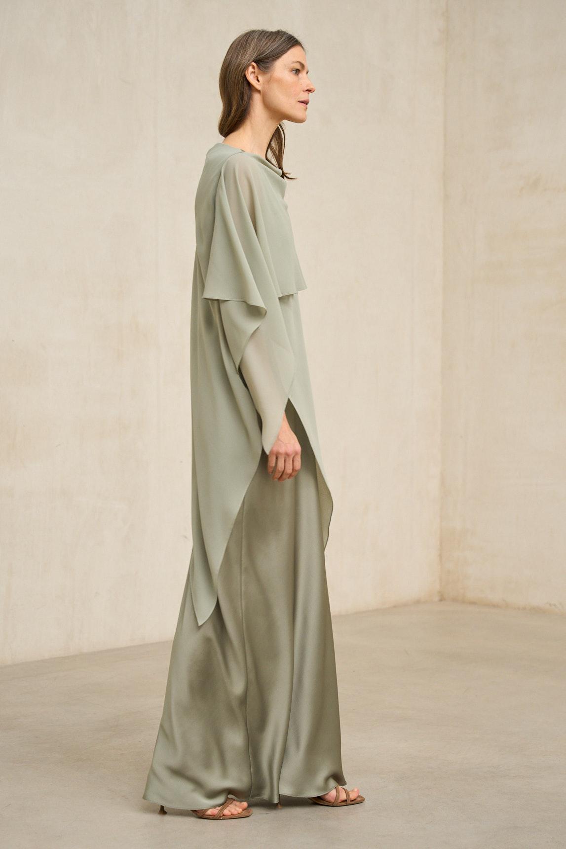 El vestido Kaedryn verde salvia redefine el concepto de vestido de invitada con una estética fluida y refinada. Su corte recto y amplio favorece el movimiento natural del tejido, generando una silueta elegante sin rigidez. La capa integrada, ligera y envolvente, se puede ajustar y colocar como fular o dejar caer suavemente sobre los hombros, aportando un efecto sofisticado y muy favorecedor. Este detalle convierte el diseño en una pieza versátil que permite jugar con diferentes acabados según el estilo deseado. El tono verde salvia aporta serenidad y modernidad, convirtiéndolo en una opción perfecta para bodas de día, comuniones o eventos especiales donde se busca elegancia sin exceso. Una propuesta equilibrada entre minimalismo y presencia. Nos esforzamos por mostrar los colores de la forma más fiel posible, pero pueden variar ligeramente respecto a la realidad.